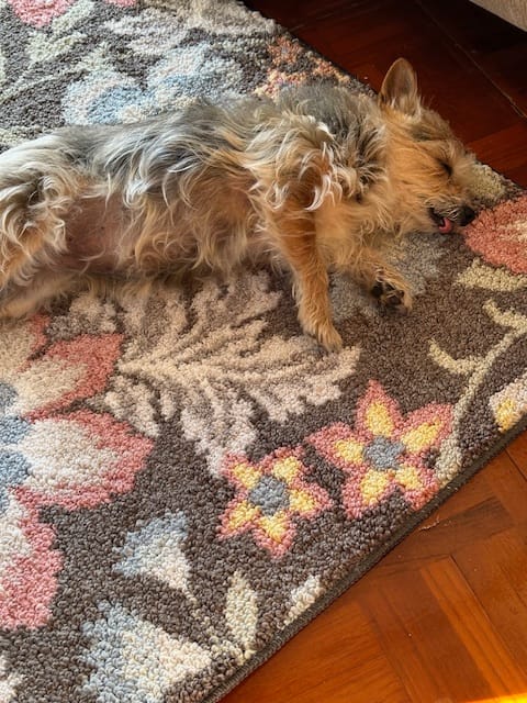 After getting the car unloaded, the first thing Brian tackled was replacing the hose on the hot water heater, so now we should never hear the fresh water pump running. We are surrounded with large yachts; haven’t yet met anyone from them. One boat next to us is a golden Looper, which means they’ve completed the Loop. Hopefully we will be able to talk to them about their trip and get some valuable tips. We are laying low for a bit before heading to the Yacht Club for pub fare. Heidi has crashed on our new area rug – guess the ride down exhausted her (she actually slept most of the way).