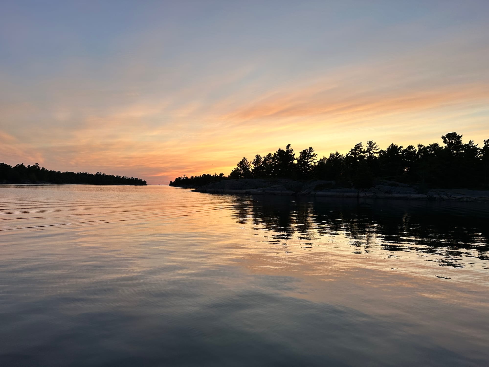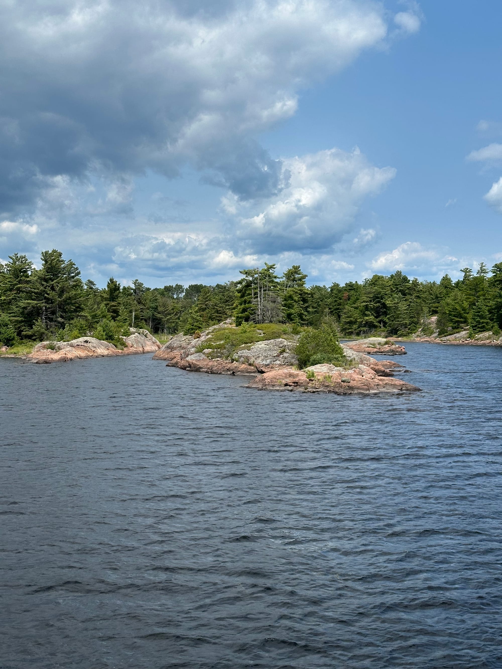 Mei said that when they were pulling up their anchor this morning, their prop hit stone and damaged it, so much, so that they were unable to use it; they traveled the whole day with just one engine running. They are now figuring out the logistics of getting a new prop (always good to have spares), fixing the existing one, hauling the boat to have it installed, a marina, etc. The life of boaters. Other than our encounter with Loopers in Half Moon, NY, this is the most Loopers we’ve encountered since then. It’s interesting listening to everyone’s experience they’ve had along the way. One couple had completed the Loop back in 2019 and were up here cruising the Georgian Bay for the season. Some cruisers take more than a year to complete the Loop because there are so many interesting places to explore and/or circumstances relating to family, medical issues, etc. tend to pivot their travels in other directions or waylay them.