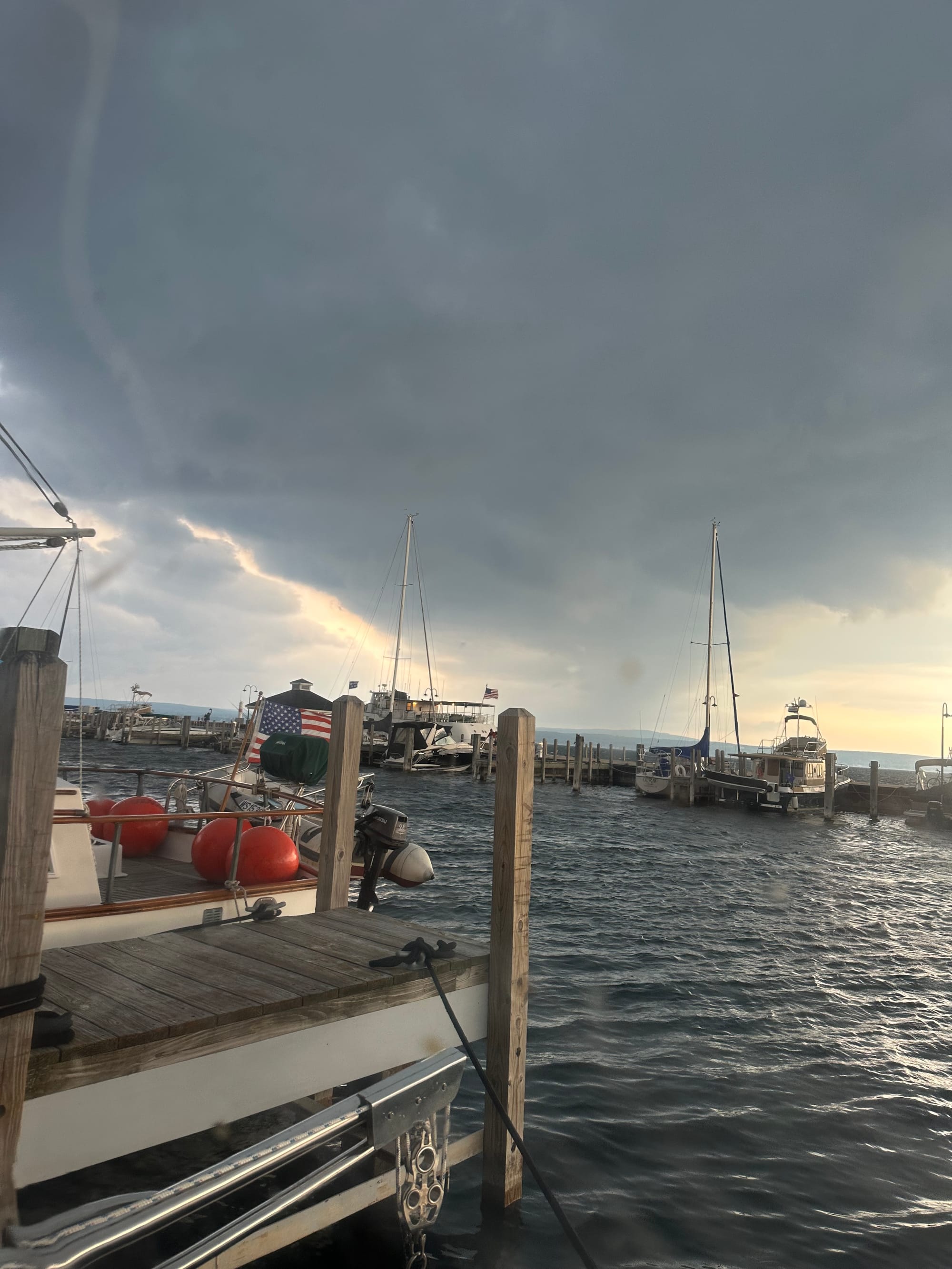 About 6:46 the winds picked up significantly and the skies darkened. Boat owners were scurrying around closing side windows, hatches, checking their lines, etc.