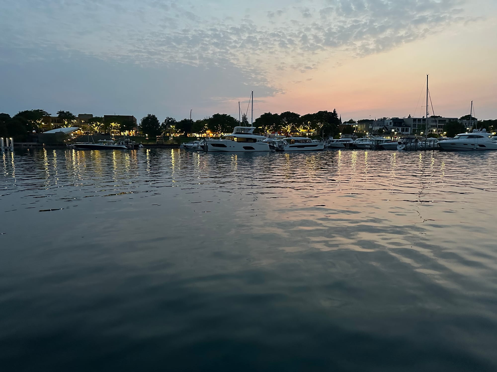 We traveled to Charlevoix today; a fairly short trip arriving by mid-morning after a pleasant and uneventful ride from Petoskey. We just made the bridge opening to enter Lake Charlevoix. Once through the short canal into the Lake, we anchored. There were two other boats anchored and we are almost surrounded by numerous boats at the marinas and condos galore; the condos have great views of the bay watching all the comings and goings of the boats and other dock life.