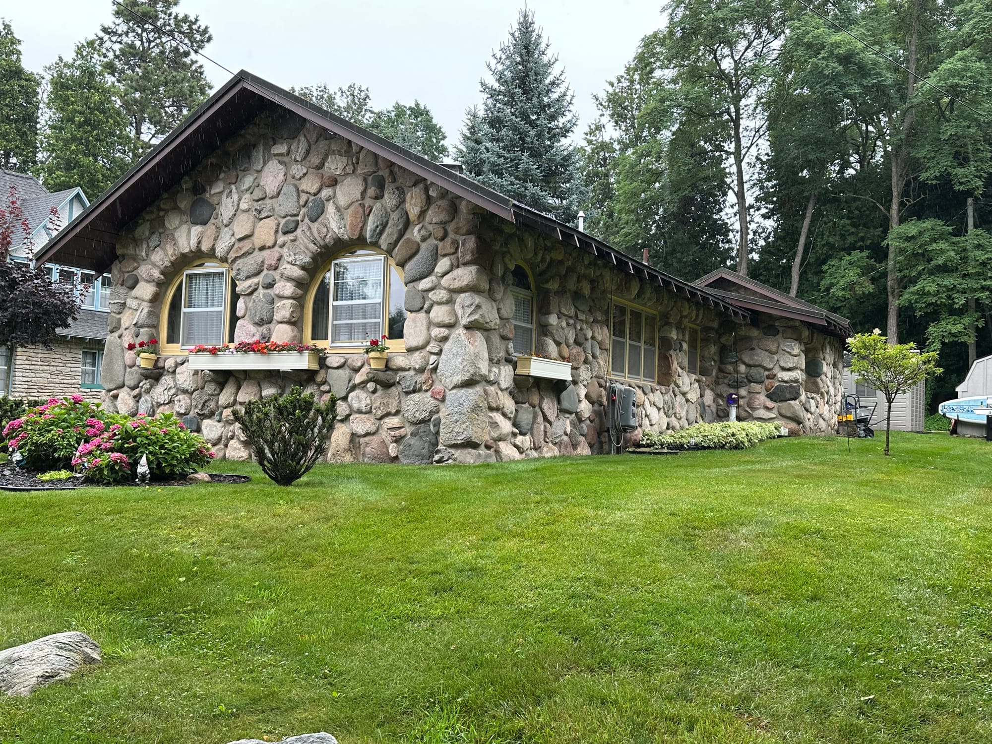 Mushroom houses were designed by Earl Young. He never used blueprints and created homes that fit the site, rather than forcing the landscape to accommodate the design. His works are made mostly of stone, using limestone, fieldstone and boulders that he found throughout Northern Michigan. His signature designs along with wide, wavy eaves, exposed rafter tails, cedar-shake roofs and a horizontal emphasis made his buildings known as Gnome Homes, Mushroom Houses or Hobbit Houses. We, along with a family of three rode around for about an hour in an open-aired vehicle while the tour guide drove to these homes for us to ogle at; the tour guide was very informative and engaging. Everyone enjoyed the trip. After our tour we stopped for lunch at the Weathervane; it overlooked the canal we came through to Lake Charlevoix. It was the first time ever, that when the Reuben was served, the sandwich was placed cut-side down on the plate. Normally, by the time one gets to the second half of a Reuben sandwich, the bottom toasted slice is damp or wet because it was served warm; so, kudos to the chef; yes, Lauren asked the waitress to let the chef know she was very pleased that she didn’t have a soggy sandwich. Back on board, we noticed, that our reserved slot on an end dock (because of the size of our boat) was still taken, Brian called the office. The person he spoke to hadn’t realized that we could not get on the dock. It was already early afternoon, so why bother now. Brian told her as long as we could get our refund, we were okay with staying in the anchorage. The management okayed the refund – yeah! Before bringing the dinghy back up on the fly deck, we will take one last trip to land and scout out the grocery store.