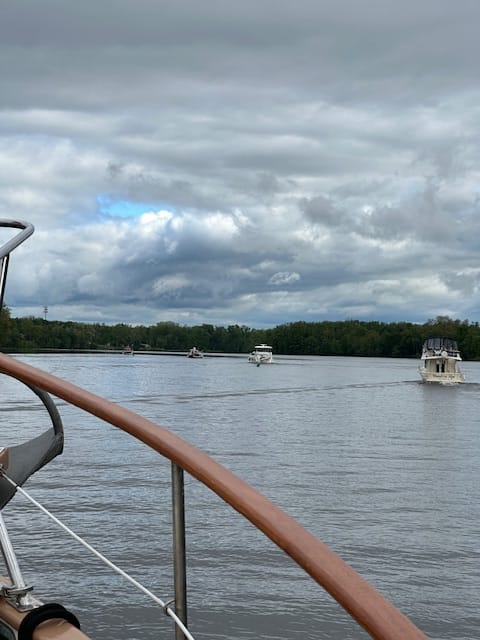 This morning, we left our dock in Troy along with Todd of Wand’rin’ Star and Mike and Pam of Carolina Can and two other sailboats. We had five locks to go through. Entering the locks and grabbing the lines to hold while the locks filled went well with all of them except for one. The fifth lock had a door malfunction, there was a tugboat on the other side of it waiting to come out. The lock master sent out a message that they had to find someone to fix the problem, so it will take some time. We all dropped anchors and sat it out. We had lunch and Lauren exercised while we waited. Didn’t keep track of the time, but figured we waited at least an hour. Once opened, the tug came through and we all entered the lock with no issues. We were trying to decide if we should find a spot to anchor or find a marina. We opted for a marina. If we had continued on, we would have had to find a place to anchor and we heard through the grapevine, that because locks further along the route were still not open, a lot of the boats were rafting up which means they were tied together in the anchorages – some 3 or 4 together. We weren’t interested in doing that. This way, we can get off the boat and walk about and check out Schuylerville. Brian called ahead to the Schuyler Yacht Basin & RV Park for a reservation. That had room for us – yeah! It was already a long day of motoring and were looking forward to stopping. The dock master told us to head to the little island before turning abruptly into the channel for the marina. The channel was fairly narrow, short and had boats on both sides. There was also quite the current running which made it rather difficult to dock. We got into a slip without any issues, but the slip was not sufficiently strong enough to hold our boat. So, it was suggested that we back out and head towards the longish dock which already had two large yachts on it. Lauren had a difficult time maneuvering the boat to the dock. She was overwhelmed because the current kept pushing the boat about and she felt there was not enough room to get our boat on the dock. After flailing around a bit, Lauren headed out of the channel and turned the boat around. It was the right thing to do. While this was happening the dock master had the two yachts on the dock move their boats back a bit to allow us in. She brought the boat up to almost bow to bow with one of the yachts and reversed the engine and got the boat in – phew!!!! She learned this maneuver from Tim, the dock master at Delaware City who had guided her onto a dock in a similar situation. Then she deflated – literally – lol. After getting the engine shut down and our notes written down in our log book, we met Mike and Pam of Carolina Can and the owner of one of the yachts whom we were sandwiched between. They both stated that they had difficulty docking and had not been successful on their first try either. Apparently, we did have an audience while trying to dock. This was the most stressful docking thus far! So, to destress, Lauren prepared stuffed peppers and steak fries for supper. That’s always been her way of destressing, thinking things through, dealing with migraines; just keep busy.