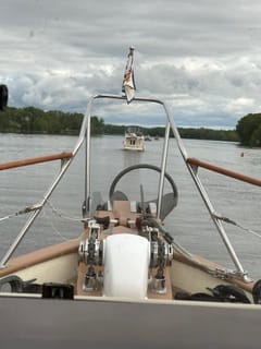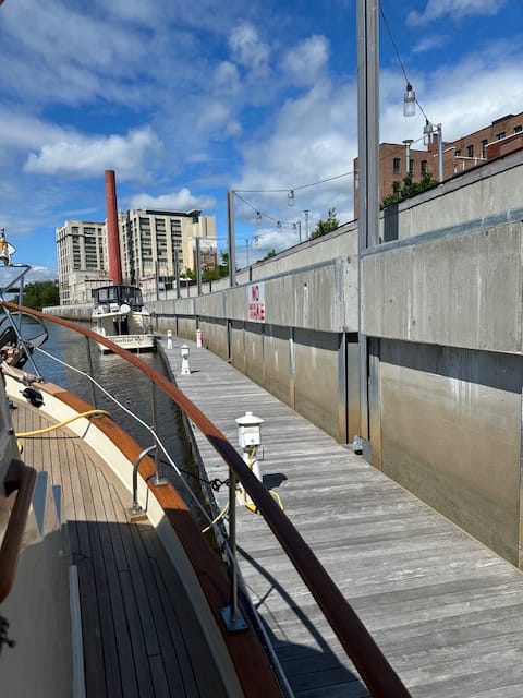 Two nights ago, we tried to take down the mast. Just as we got the stays detached, the winds picked up significantly, roaring down the river. We did not think it was safe to continue especially when Lauren’s arms were wrapped around the mast holding on. Brian reattached everything and we will wait for another calmer day to tackle that job. Yesterday morning, we got up early and Brian attached a block and tackle to the front pulpit on one end and to the forestay on the other end. All the stays were released and Lauren sat on the foredeck with the end of the line and slowly let the mast down while Brian guided the mast to the deck; easy peasy. Brian also lowered the bimini and antennas so that our boat height is now less than 14 feet. Before it was closer to 24 feet. We can now clear all the bridges that we need to on the canal systems. After doing that, Lauren cooked eggs, heated up the two leftover potato cups (potatoes smashed in muffin tins and topped with a mixture of garlic, spinach, mushrooms and mixed and topped with parm cheese), breakfast sausage and toast; a hearty breakfast. After breakfast, we hauled anchor and left for Waterford. Along the way Brian called the Waterford Visitor Center and was informed that the wall where the boats dock waiting to get thru the canal system, were two to three deep and additional boats were anchored out. We intended to also anchor out and wait for the canal opening, but while going thru Troy we saw that the City of Troy Docks only had one other boat on it. As we were trying to slowly approach the dock system (the currant was rather strong against us), Eric came off of his sailboat (he was on the free dock) and helped us tie up. After making sure we our lines were secured, we connected to power. Brian called Dockwa (a boat slip reservation app) and was informed that the vendor that manages this dock was no longer doing so and that the city was in the process of finding a new vendor. Within a half hour, Brian met Tom, a retired fire fighter from the city of Troy and the new dock master. Tom could not have been nicer and informed Brian that he thinks the city is going to start renting the dock space sometime the end of this week. He told us we were fine where we were and gave us his number in case we needed anything. Brian also met Todd on Wand’rin’ Star on the same dock as us and chatted with him for a while. Brian had actually met Todd back in Delaware City where he had some boat issues that have been taken care of. Todd has been here for several days.