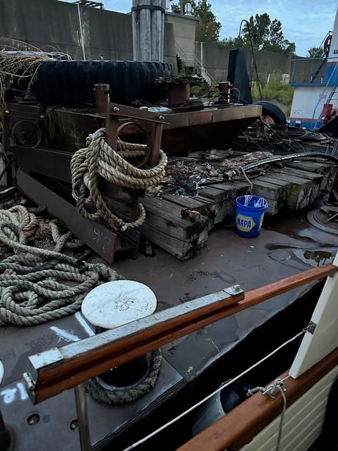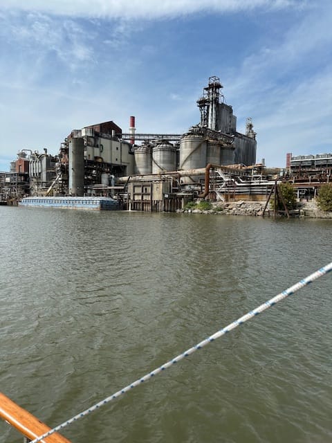 Encounter three tugs with barges. Passing the last one, the tug captain radioed us and said “Cool looking boat.” He actually came out of his pilot house to check us out. Brian thanked him and told him what kind of boat it is and gave him a wave.