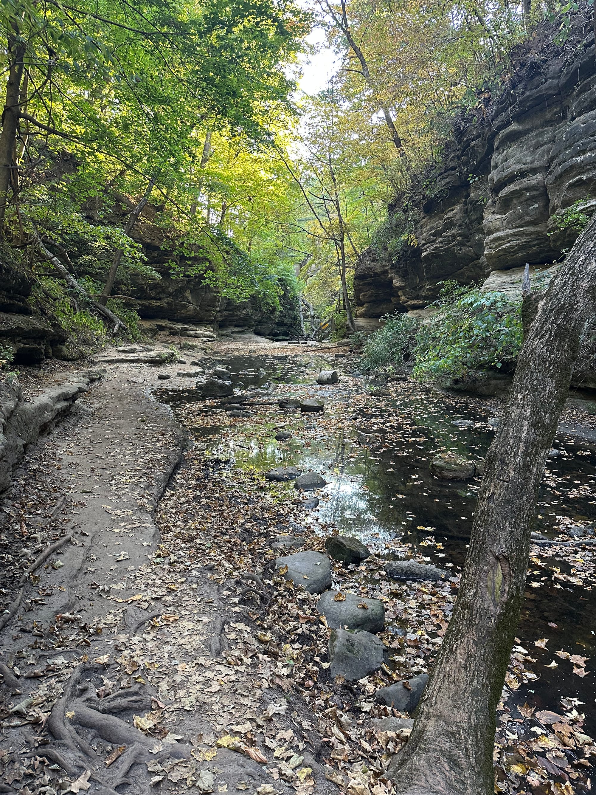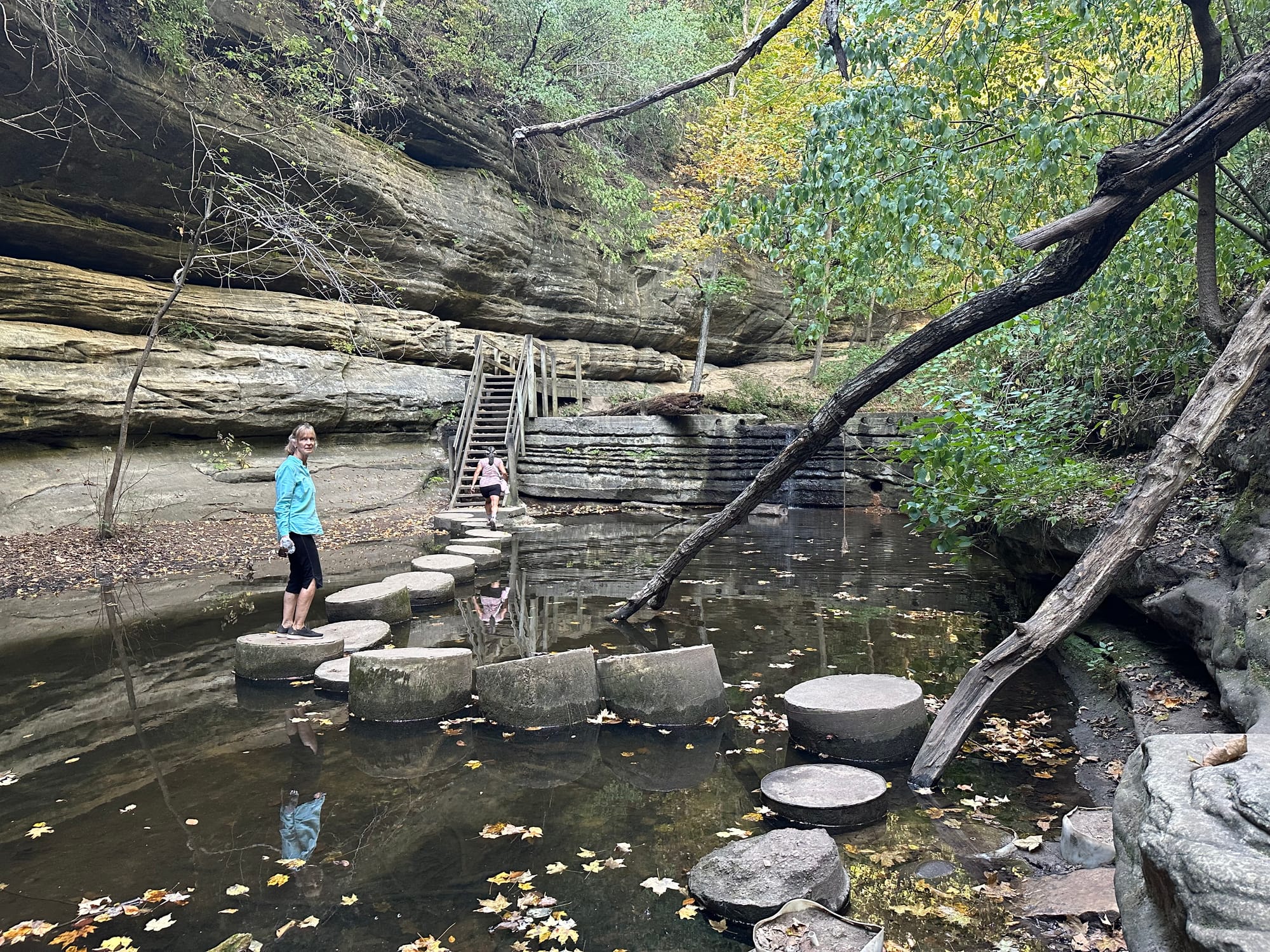 I failed to mention in the last entry that we had gone on a “hike” with Kevin and Tina Rhodes on Cross Rhodes when we were in Ottawa at the Heritage Harbor Marina. The area was originally referred to as “Deer Park” in reference to the large deer population. The original 176-acre park consisted primarily of a long, narrow canyon with a small stream flowing through it; these formations were called “dells”; a name that stayed with the park. The park has grown to 1,938 acres and includes much of the significant natural land along the main dell, some former prairie land and some forest land. After Spring rains, this park is definitely a highlight when the waters flow through the dells. At the time of our visit, there was barely a trickle of water flowing from the crevices in the rocks and little standing water because of the drought. It was still a good walk and a nice distraction from the boat.
