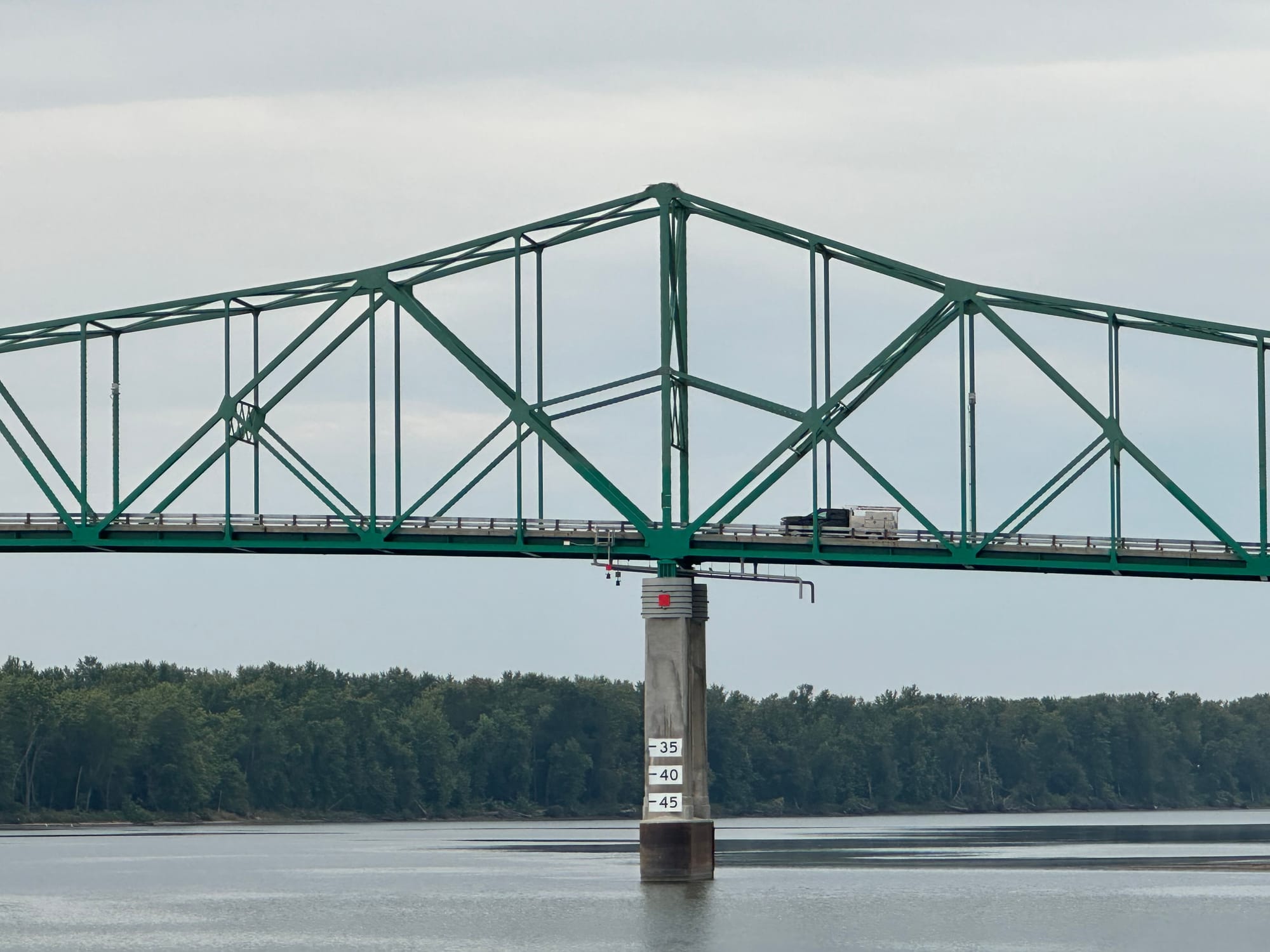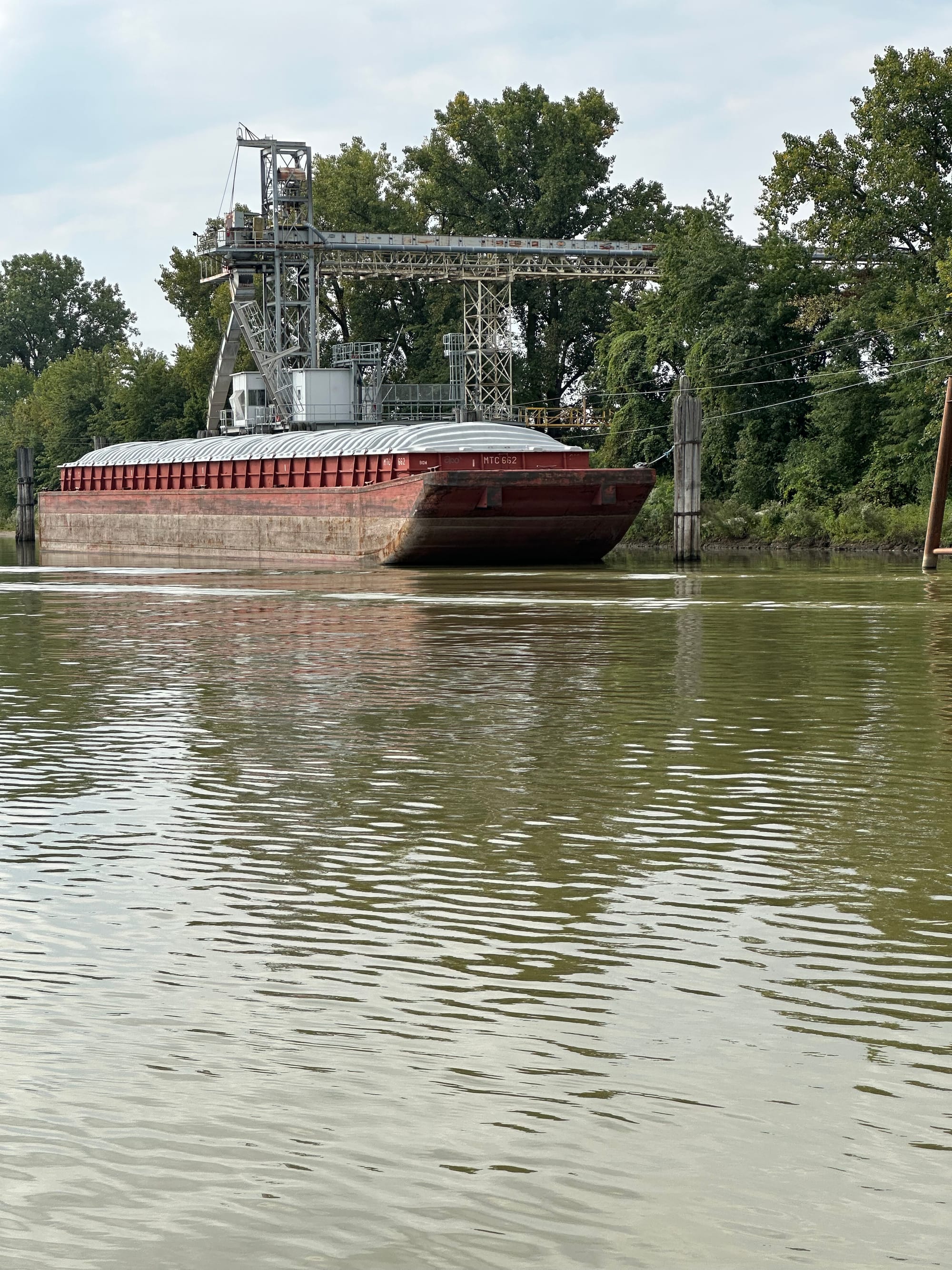 Yesterday early evening another two boats came into the anchorage; one was a Looper – both homeports were Louisiana. It was a cloudy evening, so unfortunately no star gazing, but glad to be in a nice snug harbor. Anchor was up by 7 this morning and we headed out of the anchorage with Pelican. It was an overcast day, but absolutely beautiful on the water. There were no locks to deal with and encountered only three tugs with barges. The river was so calm, the sun peeped out and we just meandered down river. We did have to wait just a few minutes for a railroad bridge to raise. Other than that, there were no delays. Arrived at Beardstown Logston Tow. They have a barge they allow pleasure boats to tie up to. There is no electric or water; just a place to tie off after a day of cruising – very convenient if there is room.