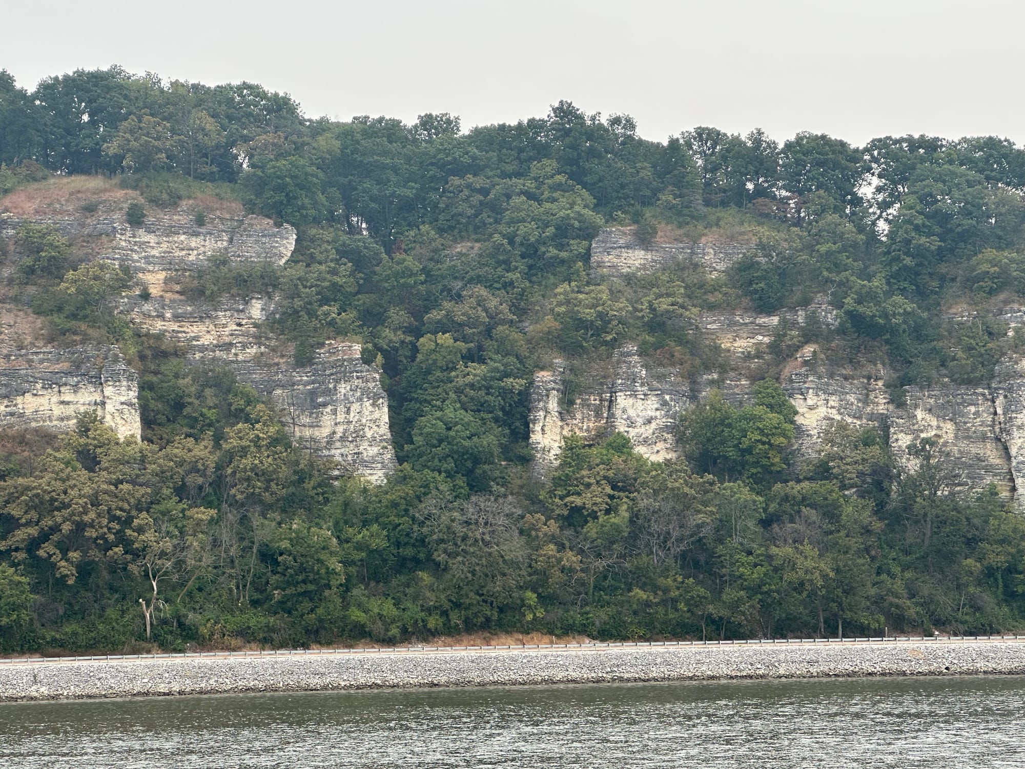 Today we noticed the topography on both sides of the river have significantly changed; no longer flat with trees, but very hilly with rocky bluffs along the eastern shore. These bluffs had some mansions on them overlooking the river; what a view for them!