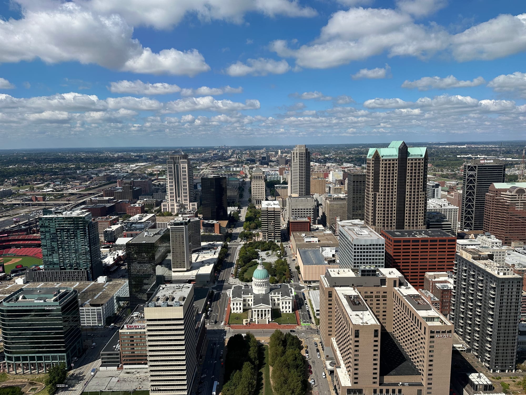 The Gateway Arch National Park is a park centered around the 630-foot-tall Arch. It is the tallest monument in the U.S. and a symbol of America’s westward expansion. The park includes an underground museum detailing St. Louis’ history and the westward movement, the Old Courthouse and a unique tram system that takes visitors to the top of the Arch. The tram system is a series of egg-shaped pods that can seat 5 people (tightly packed with almost no head or leg room). The door consists of a window so you can see some of the infrastructure of the arch as the pods are climbing to the top. Even though the ride only takes 4 minutes to get to the top; if you are claustrophobic, it may not be for you. Lauren was not all that comfortable being in such tight quarters.