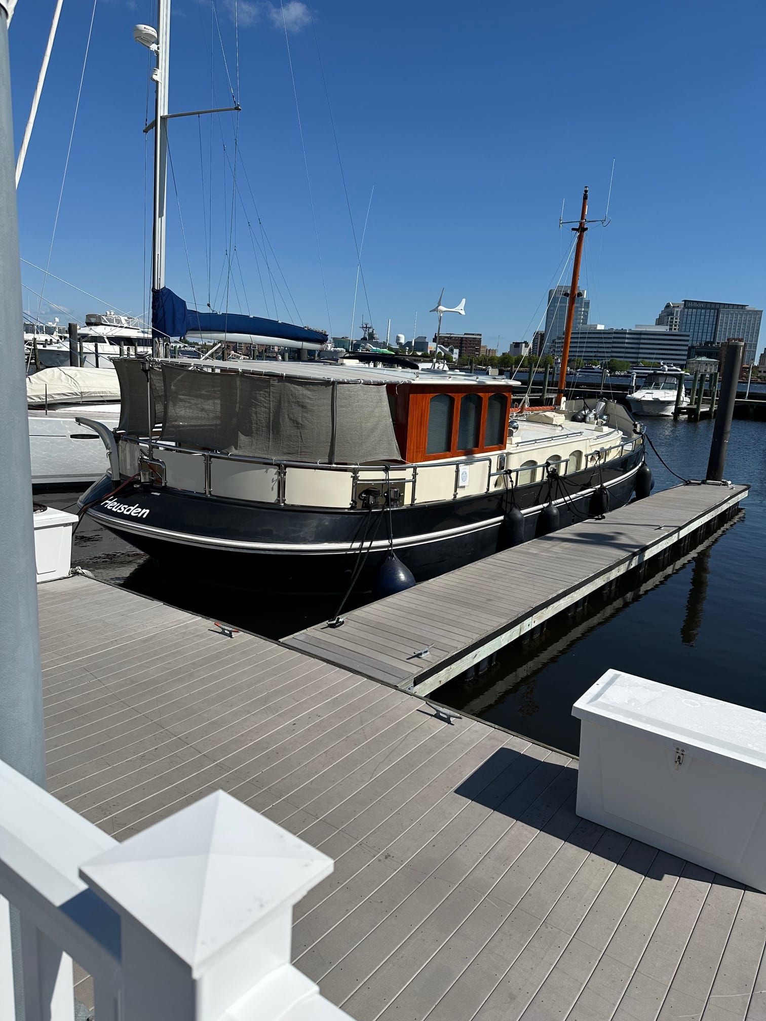 Bob, the marine tech was able to stop by and he discovered that one of the pins in wiring harness that attaches to the regulator had a broken connecting pin. So, we’ve had to order a new wiring harness. Hopefully, this is the solution to all the issues we’ve been having with our alternator and regulator and we are done ordering parts. We were told the item would be shipped out overnight, but haven’t received any shipping info yet. Took a stroll downtown this afternoon to enjoy the nice weather. Met Mary Ann who is on Hauser which is a replica of a European canal boat. Her husband passed away a few years ago and she is single-handling the boat – so brave of her. Her boat looks exactly like the pictures of the barge boats of Europe, except this one has been meticulously kept. We also met, Fritz who came in on a Kadey Krogen 52. His boat is named Luna after their dog and Fritz laughed when we introduced Heidi and told him our Kadey Krogen was also named after her. Dinner was lamb chops, mashed potatoes and asparagus – yum! We are now sitting on the after deck for the first time enjoying the lights in the marina and the calm, warm weather.