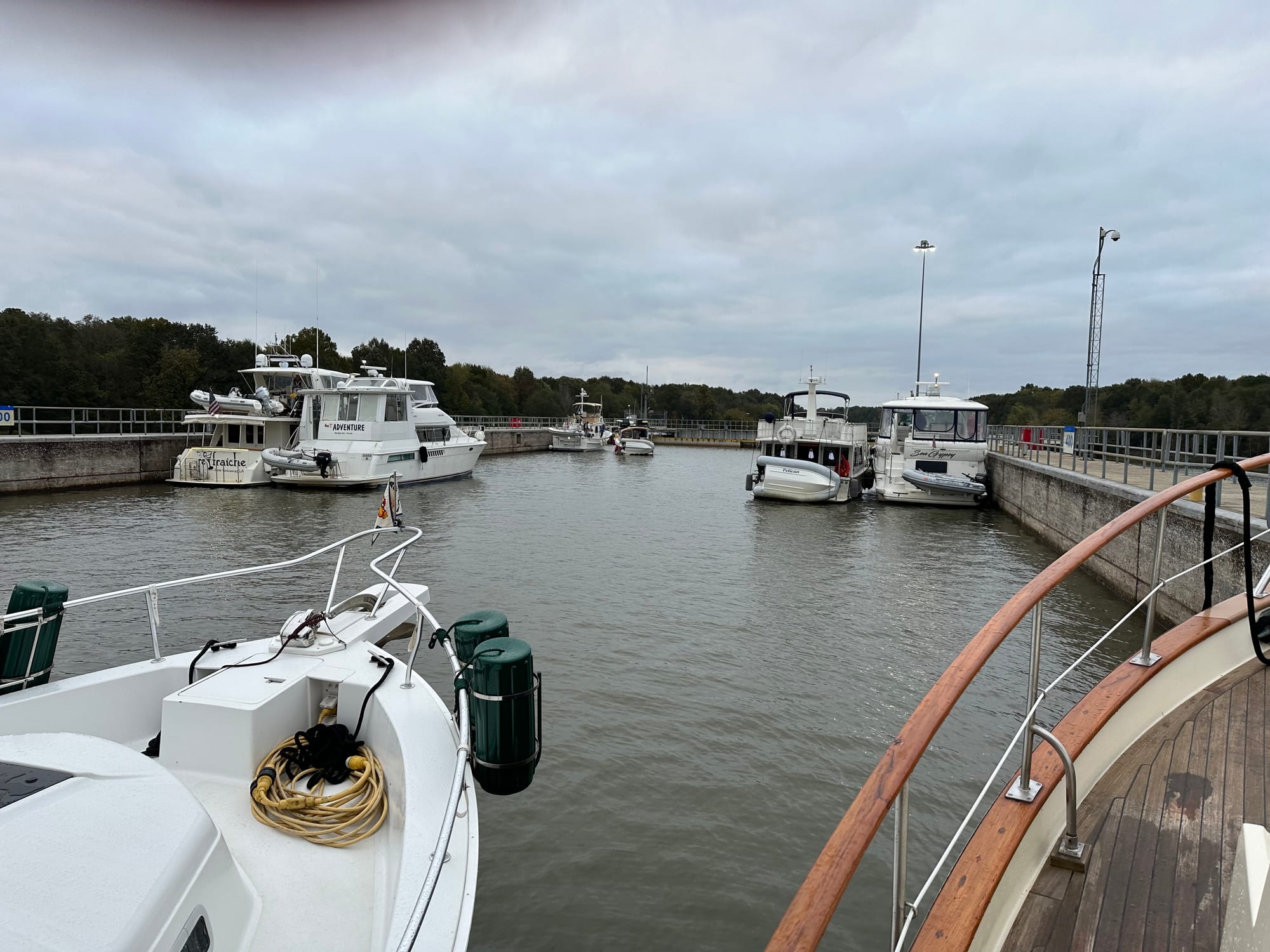 This morning anchors were up at 6:45 and we were all on our way for the day. There was mist on the river; it cleared up pretty quickly, but it was beautiful. Today we had 2 locks to get through. We all made it to the first lock which was almost full with the Loopers from the previous day; they had gone ahead yesterday to a marina near the lock. The lock master held the gates for us and we all squeezed in. Leaving this lock, the fast boats took off first; which is fine. They don’t like being stuck behind us pokies. Several miles out from our second lock, we were informed that there was a barge heading in and had first priority. Lauren put the boat in idle forward and we crawled towards our destination. It takes quite a while for the barge to get into the lock, fill or drain (this time drain) and then get the barge out of the lock. By the time we moseyed up to the boats that had been hovering waiting to get into the lock, the lock master was ready for us. Crawling along the last several miles was much better than hovering in the channel and jockeying with other boaters. Lauren had to do that yesterday at one of the locks for at least 1 ½ hours – not her favorite thing to do.