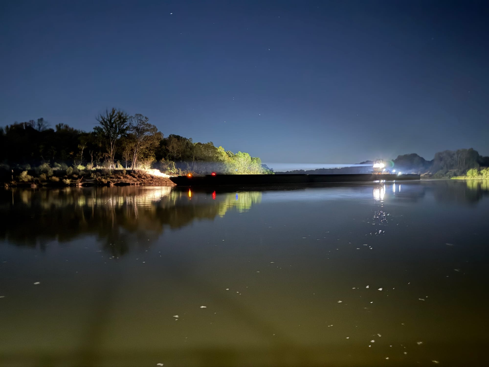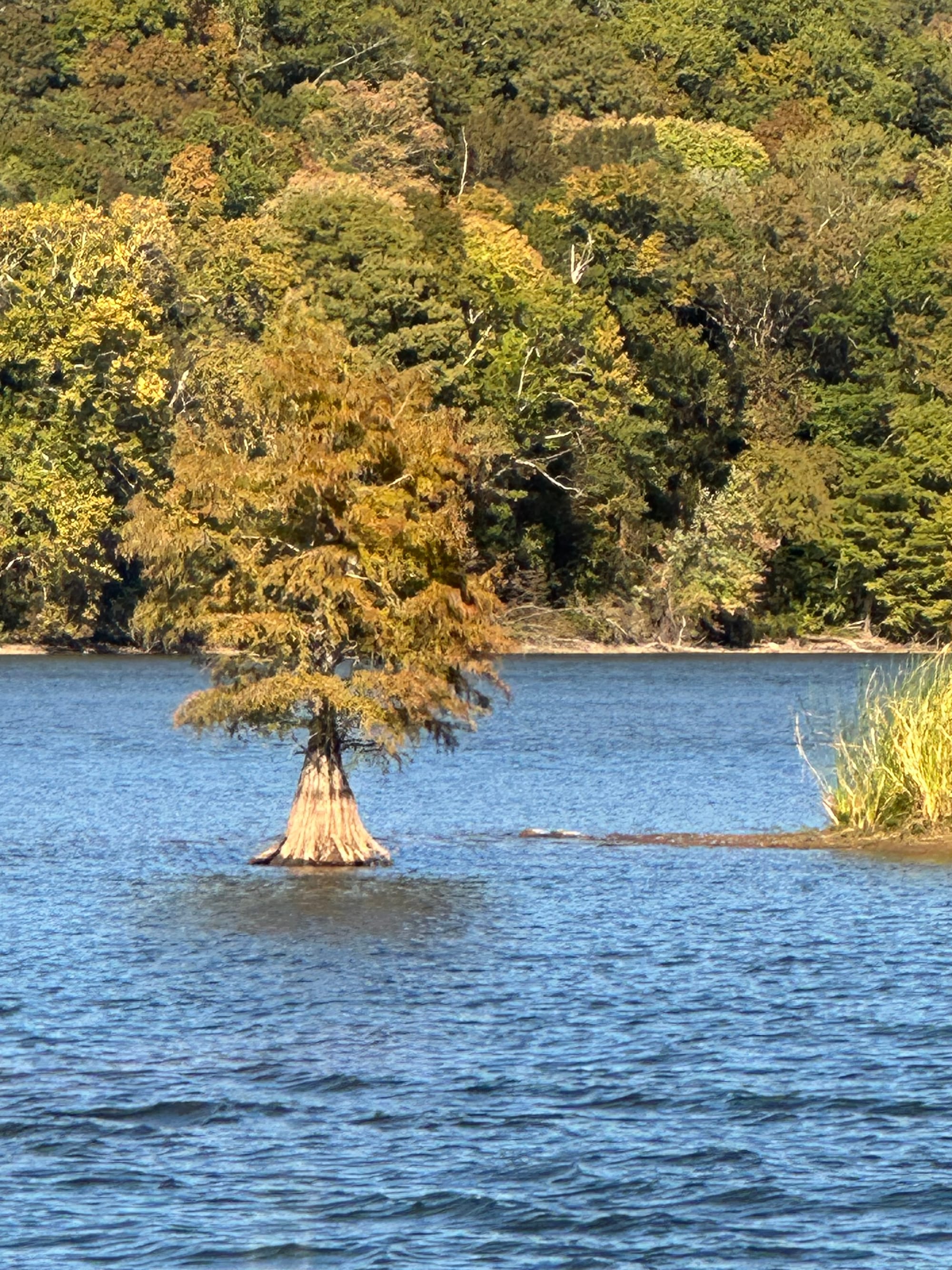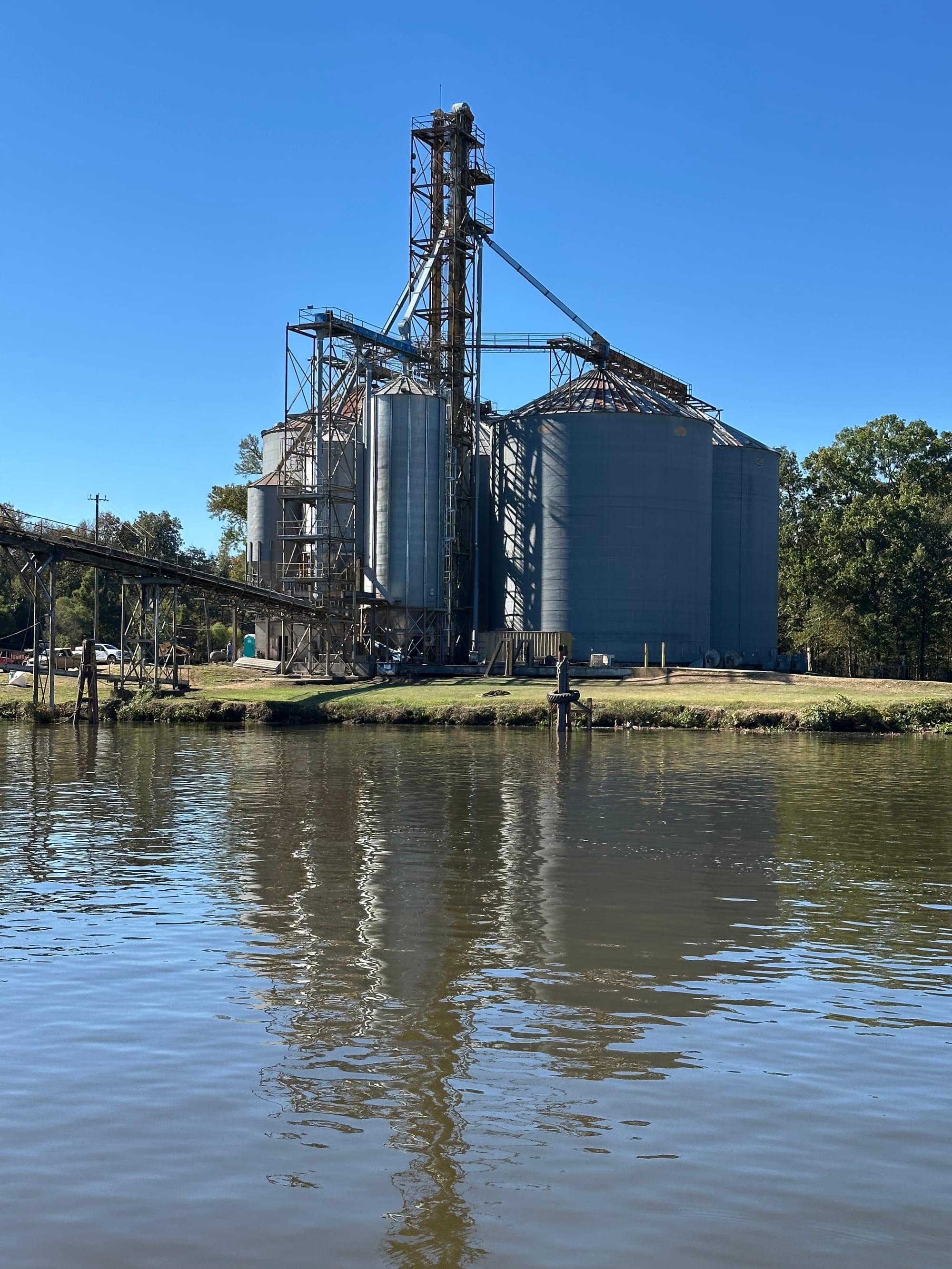 We left Kingfisher Marina at 7:15 after Brian called the lock master to make sure the 8:00 opening was still good for pleasure boats and no barges were scheduled to go through. We were cleared to go. Brian relayed the message to our traveling companions and off we went. The lock was only 3 miles from the marina. Once we got close, we idled forward until we saw the green light to go. The lights weren’t working, so we watched for the gates to open. There were seven boats locking through; all went smoothly. Once through, the faster boats went on by and the rest of us moseyed along at about 7.5 knots. About 1:00 we dropped anchor on the side of the river out of the channel at a bend in the river. Shortly after dropping our anchor we noticed a barge coming towards us. Brian called on the VHF to inform the Captain of the four boats anchored on the bend. He was not happy and berated us. He informed us that we could be crushed there. Sounded like he was just in a pissy mood. Were we are anchored is a designated anchorage and we were well out of the channel and close to the shore. His barge and four others passed by with plenty of room.