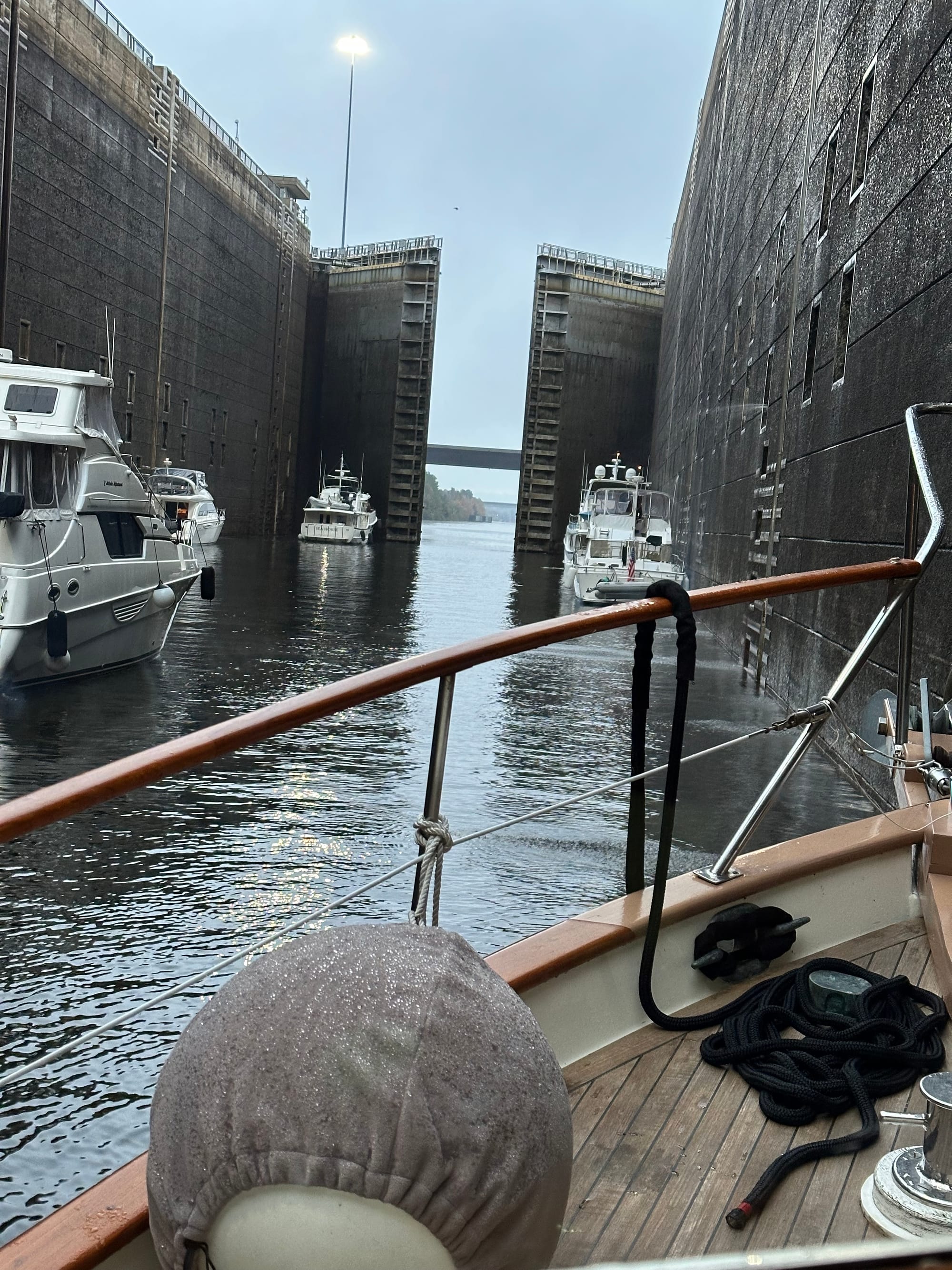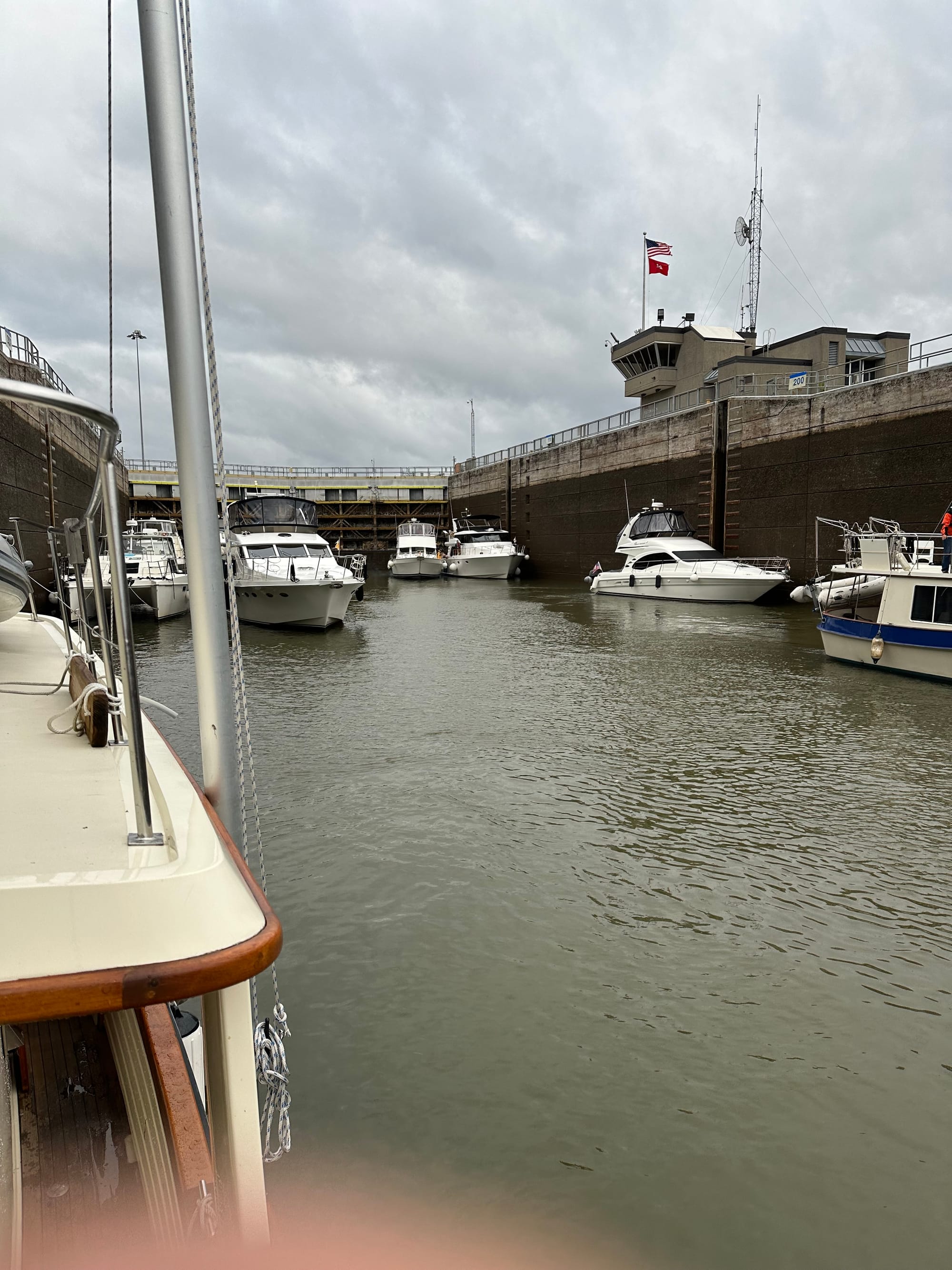 Left our dock at Mid-way Marina at 6:45; shallow water behind our boat, but there were no issues backing out of the slip. Lauren followed her cookies from when we entered our slip, out to the channel. It was a gray, overcast day to start, but by late morning the sun was starting to peak through. We had 3 locks to get through along with another 18 other boaters. We were all able to fit into the locks each time. Half of the boats had to raft onto boats that were tied off to the pins. It was a great way to meet those traveling the Loop; we think all the boaters were Loopers. Other than jockeying for positions in the locks, it was an uneventful ride. We dropped anchor at a few minutes to 5. Lake Effect, Pelican and L’ Attitude Adjustment were our neighbors in the anchorage. It was a long day and Lauren was glad there were leftovers to eat so she didn’t have to cook.