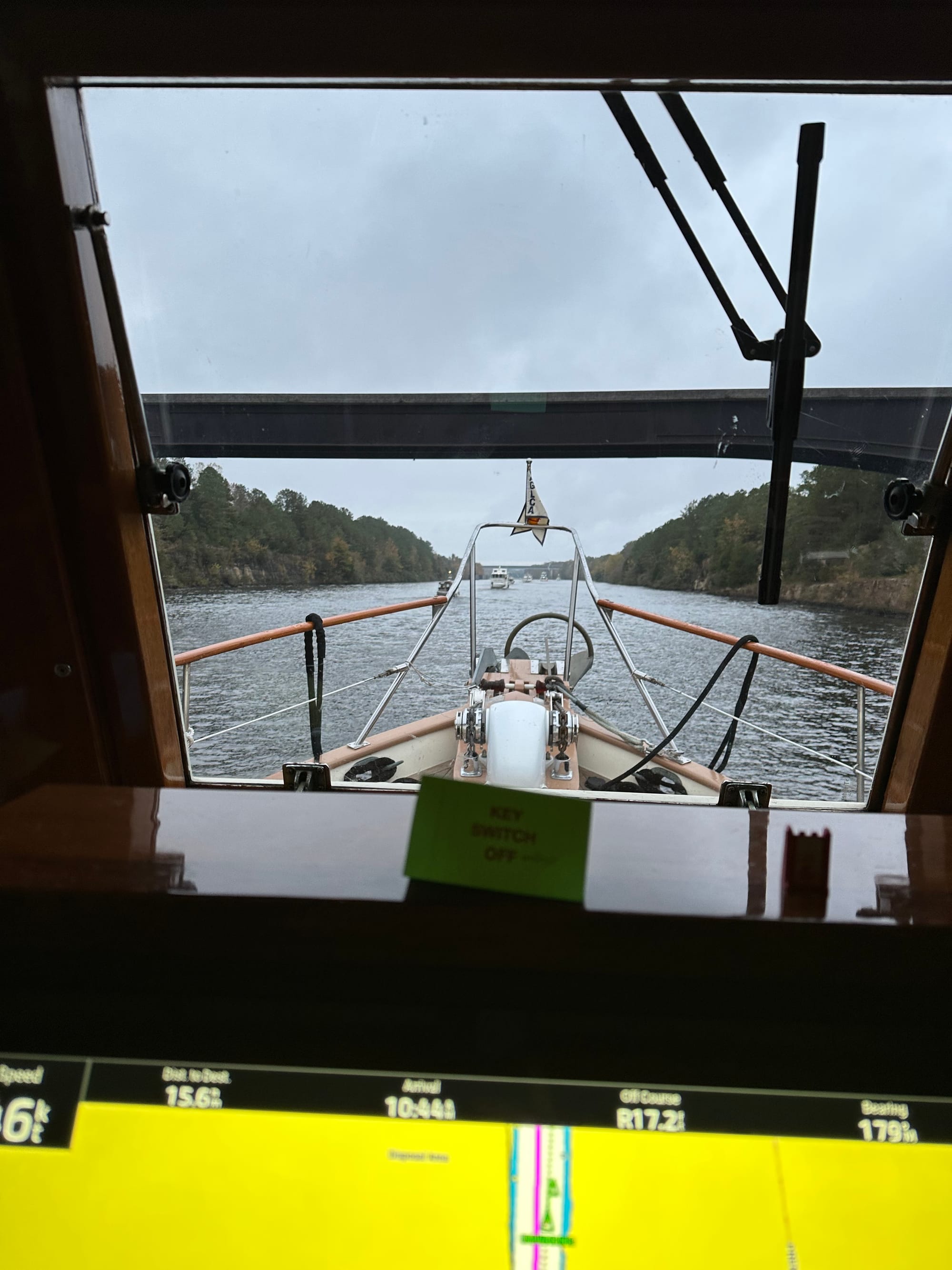 This morning, we left Bay Springs Marina at 6:25 because our first lock encounter today opened at seven. It was pitch black when we pulled away from the dock. Lauren is not comfortable with navigating in the dark. She followed the cookies on the chartplotter from when we arrived, making it easier to get out onto the waterway. There were 10 boats in total heading to the lock. We had 3 locks to get through. Because there was no commercial traffic scheduled to get through the locks, all of us pleasure boats were shuttled right through locks 2 & 3. There were so many boats arriving at once to Midway Marin that we were asked to hover in the channel. Since we were the last boat in line, Lauren put the boat in idle forward for the last mile knowing it would take a while to get all the boats docked. Our slip was in the last uncovered row of the marina. The depths were a bit low – saw 5.2, but we got in without any issues. Since we’ve arrived here at Midway, there were an additional 8 Loopers that come in. The day has been overcast and rainy all afternoon. The rain is supposed to continue through the night and all day tomorrow and the temperature will drop the 50’s during the next two days. We are so thankful we have an enclosed nav station. Lauren ripped apart the stateroom cleaning out drawers and wiping down cabinets. She gave her pinky a workout on the slatted doors; 278 slats just in the stateroom.