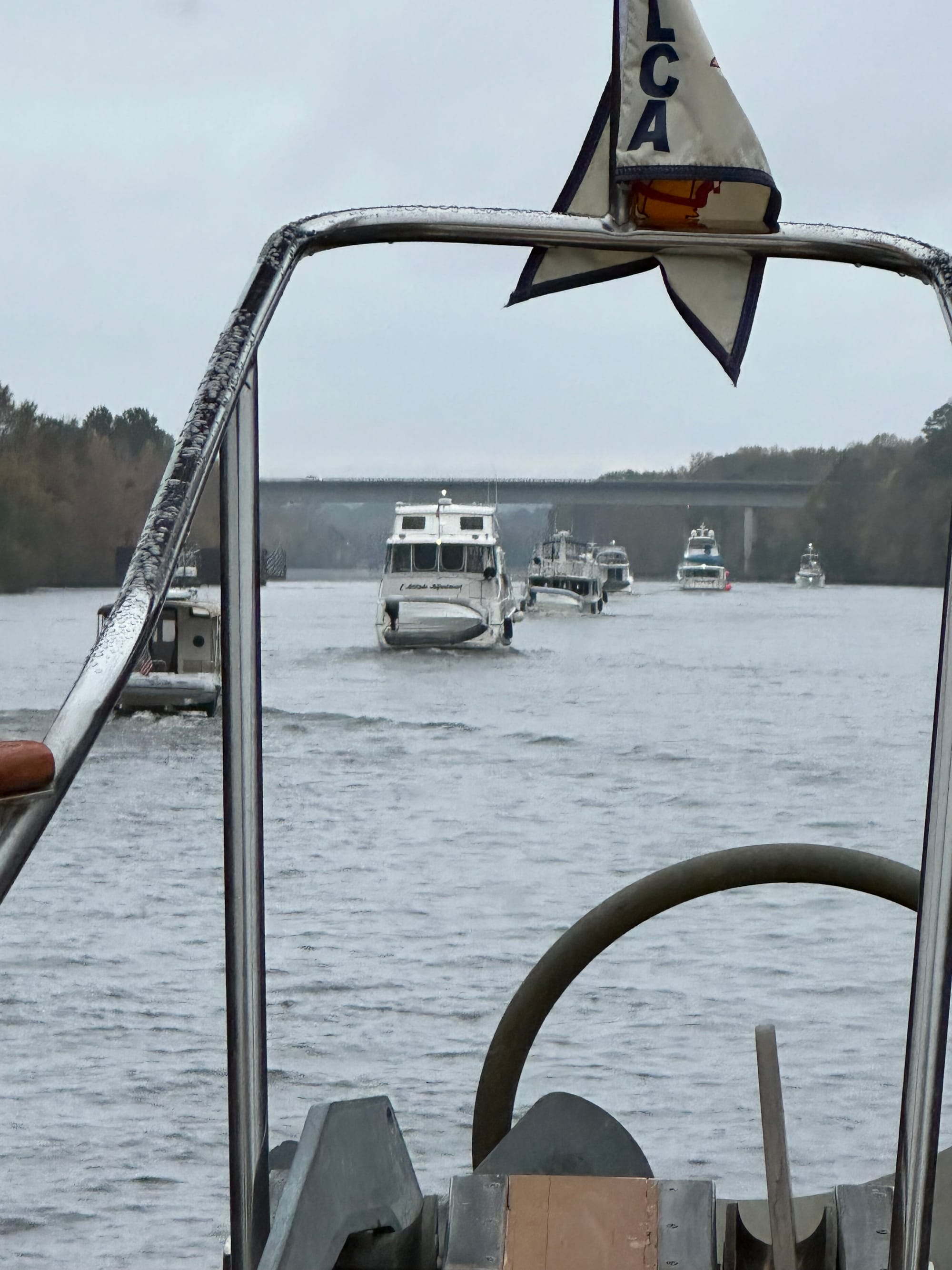 Left Aqua Marina just before 8:00 along with Pelican and Lake Effect and started our cruise for first the day on the Tennessee-Tombigbee Waterway. The Tenn-Tom is a 234-mile artificial waterway build in the 20thcentury. It took 12 years from 1972 to 1984 to complete the waterway. It is the largest building project in the history of the US Army Corps of Engineers. It is over five times longer than the Panama Canal and required the moving of over one-third more earth. The total lift on the Tenn-Tom of 341 feet from one end to the other is more than 3 ½ times that of the Panama Canal. Navigating this waterway, as opposed to taking the Mississippi River, saves time and money by reducing the trip to the Gulf Coast by more than 800 miles.
