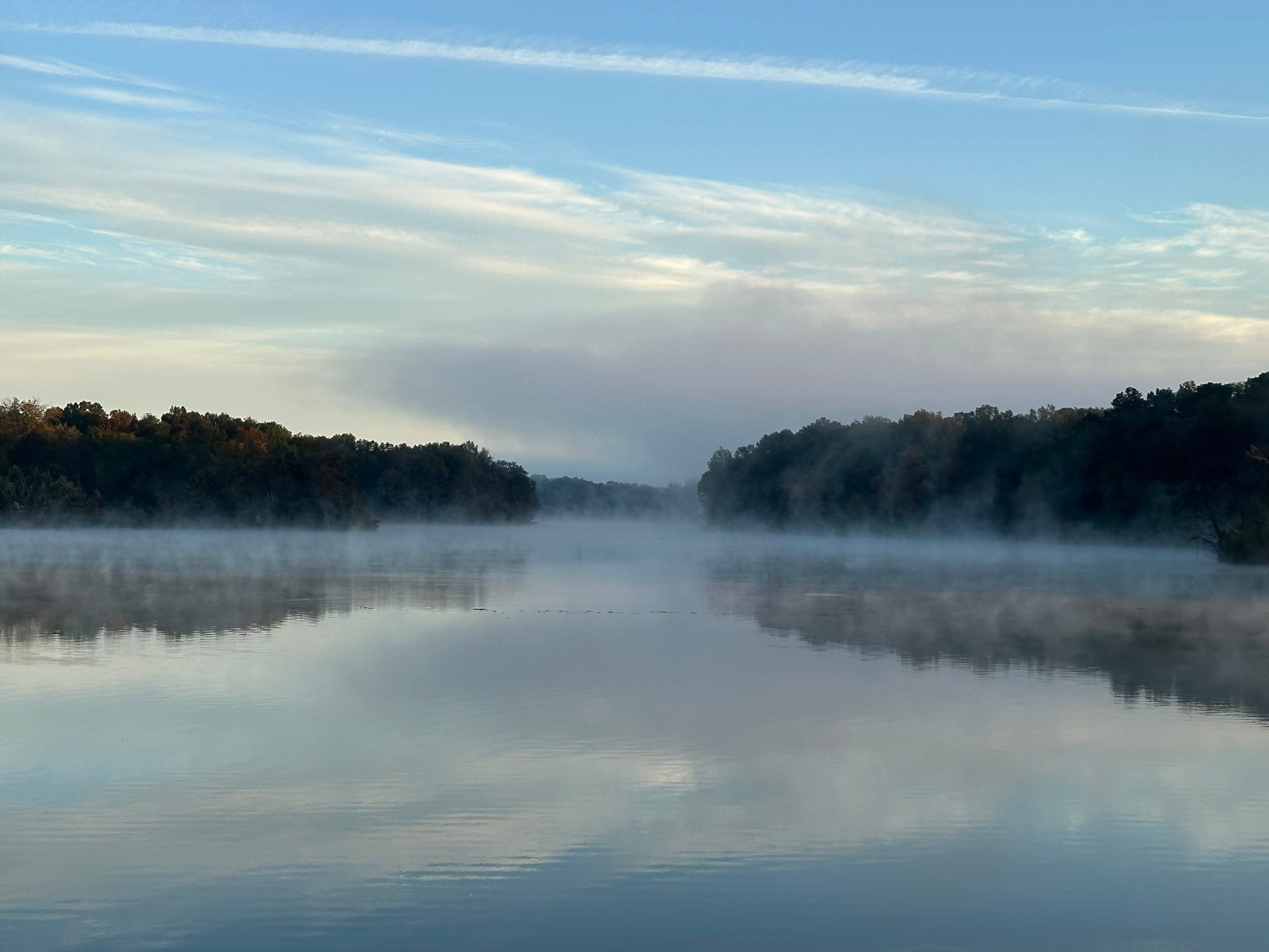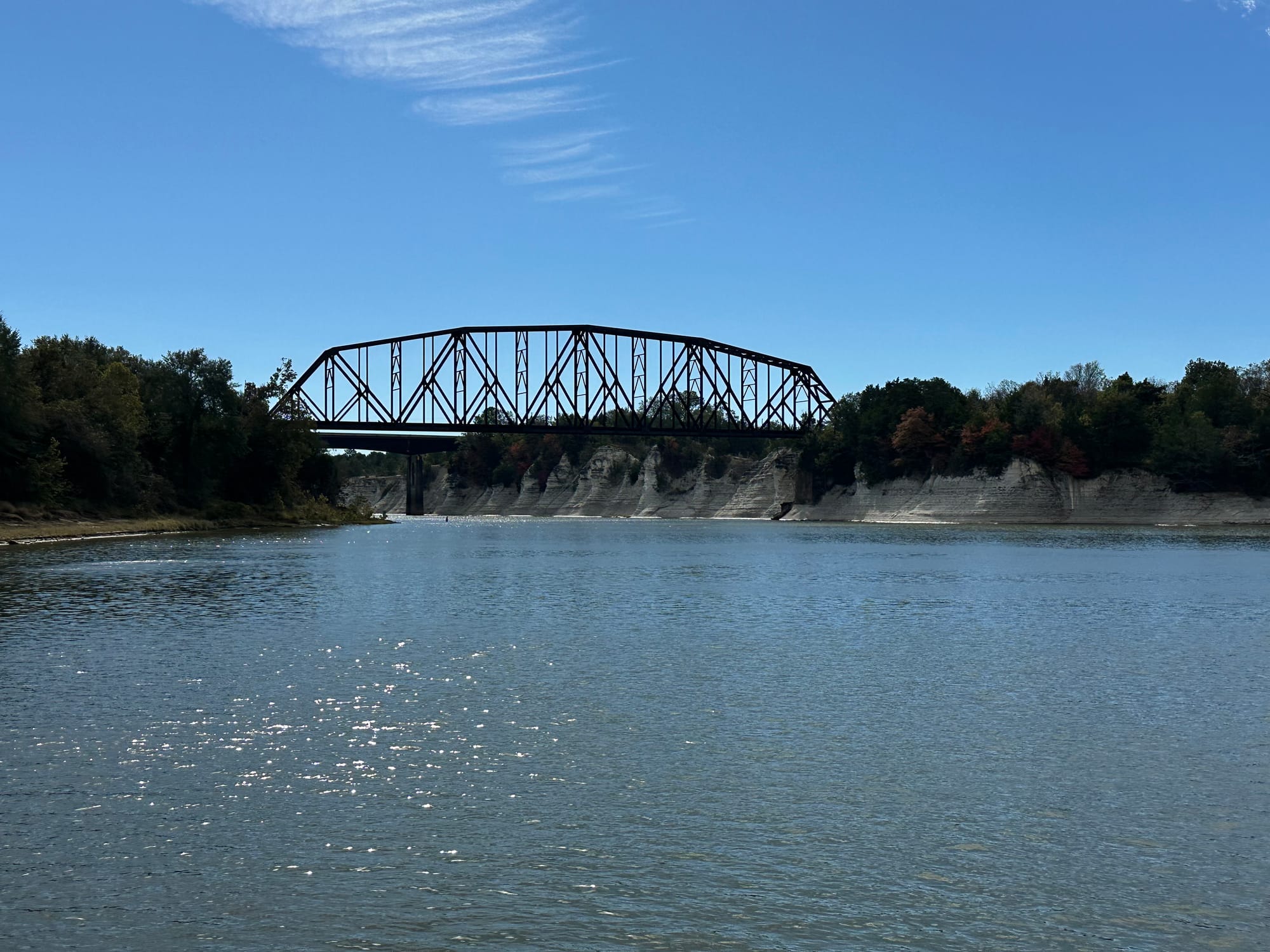 Left Kenlake Marina at 6:50. Exiting the marina into the river, found us in a fog bank. Brian pulled up the radar and overlayed it on our chart; this helped as we couldn’t see a darn thing; a bit un-nerving even when Lauren follows the route planned. Thankfully, the chart plotter has all kinds of tools to help us navigate. It took about two hours before the sun burned off the fog; after that it was an uneventful ride. We only passed three tugs with barges and encountered three bridges. The last bridge of the day was a railroad bridge. Brian called the bridge attendant inquiring about clearance. He was told 26ish feet. Our boat’s air draft is 24 feet with everything up. When we got closer, we could tell we had at least 6 feet of clearance. It was a beautiful sunny ride, but way too long. We exercised to keep from getting antsy. Other than the tugs, we saw only two other pleasure craft. The first boat was about 60 foot long. He came up so suddenly. Even though he had AIS, we did not see him until he was beside us because he came up so darn fast. He was three quarters the way past when he hailed us. He wanted Lauren to slow down so he could pass. Good grief! Even though he slowed, he was still going almost 3 times our speed and requesting us to slow down when he was already beyond us. Lauren replied to just keep going and turned into his wake which was pretty substantial. The captain then opened the throttles and took off; we noted on our chart that he was doing 30+ knots. We traveled 63 miles down Kentucky Lake; it took us ten hours before dropping anchor just off Cuba Landing Marina. Thankfully the channel entrance was well marked as it was rather shallow getting into the anchorage area. There were two other Loopers anchored; one was a Golden Looper. Tomorrow will be another long day – can’t wait!