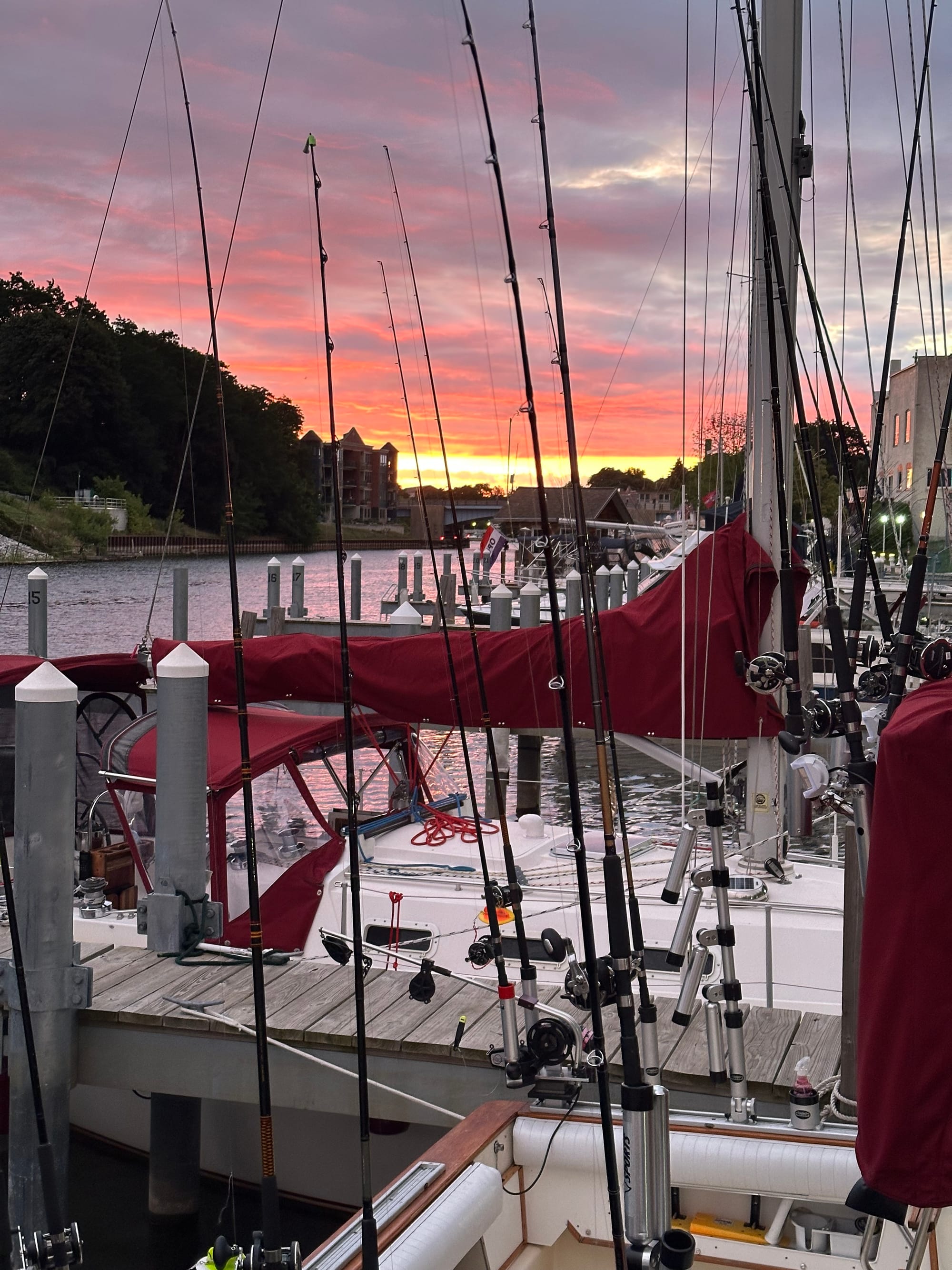 Pulled up anchor early this morning and headed off to Manistee. The waters were choppy with some whitecaps, but on the nose, so not uncomfortable. Did not dose Heidi. The sky was overcast, but eventually cleared and the waters calmed for the better part of our journey. The only thing we saw were numerous fishing boats, near and far. As we were entering the break water entrance, we saw a buck; eight points and all in velvet. There were two does at the waters edge. We opted to get a slip for at least two days as the weather forecast for traveling didn’t seem optimal to us after today. Once docked, it was a parade of all kinds of fishing boats; loaded with no less than 10 fishing rods on each boat. It is now 2:30 and the fishing boats are still arriving to dock. We are parked next to a motor vessel that is for sail. One other trawler did come in and it’s a Looper. On the other side of us is a County Sheriff boat, next to that is a Coast Guard boat and next to that one is a fire boat. Brian went for a haircut while Lauren took Heidi out for a much-needed walk. Then out for a lunch at TJ’s Pub.