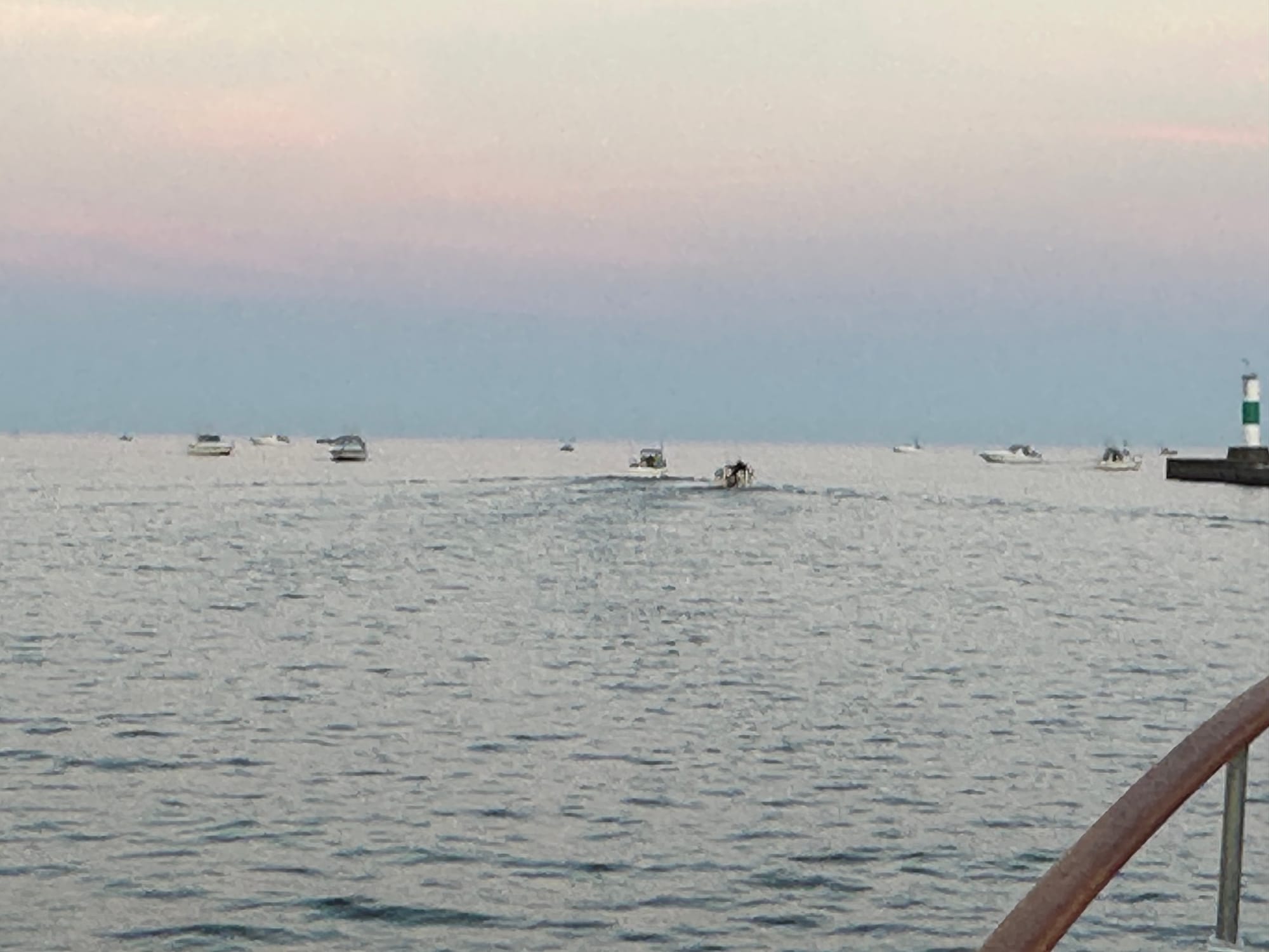 Left our slip in Grand Haven about 6:40; turned on the running lights since it was still dark. Once we got to the mouth of the channel, we were inundated with fishing boats. Lauren poked along trying to get through them; most of these guys do trolling, so she tries to maneuver to the front of the boats so as to not snag their lines. We were about half way through this group when a small skiff kept coming at us from the port side. Since our running lights were on, he should have known that we definitely had the right of way showing our red light. He didn’t seem to care and Lauren had no way to get out of his way. Brian finally stepped out on the port side and raised his arms to him, like HEY? The guy yelled at us, but did finally turn away. The rest of the run was smooth.