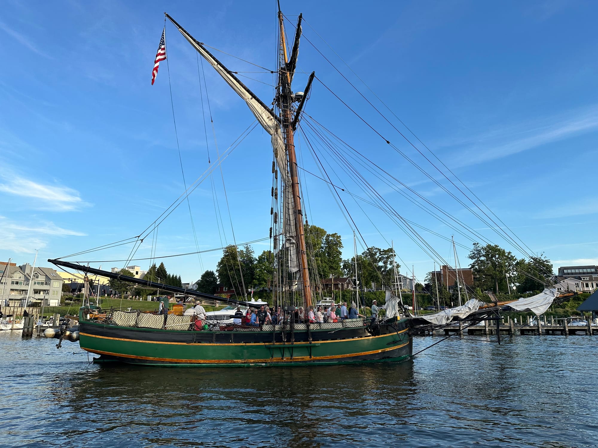 There are wood ducks swimming nearby. The anchorage is the biggest we’ve been in so far. Watched Piper come in and take a slip across from us. We are the only trawler anchored along with about 10 sailboats with plenty of room to spare. Tomorrow, we travel to Manistee Lake to anchor. We will leave rather early, as the anchorage is small and we want to make sure we get settled in before it gets full. We may hunker down there for a few days, as the forecast for the weekend may hamper our travels.