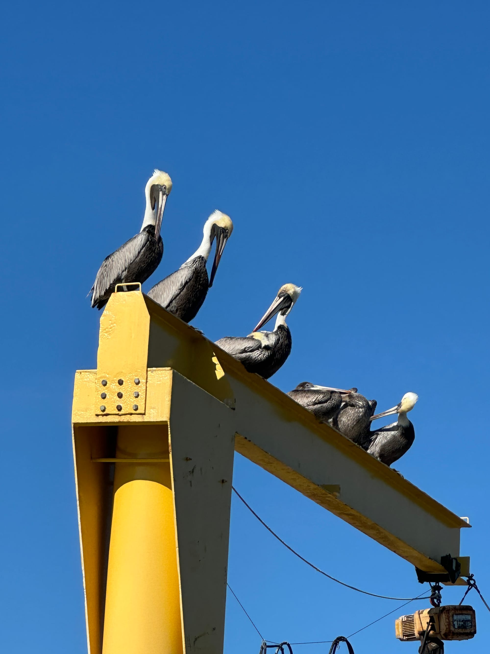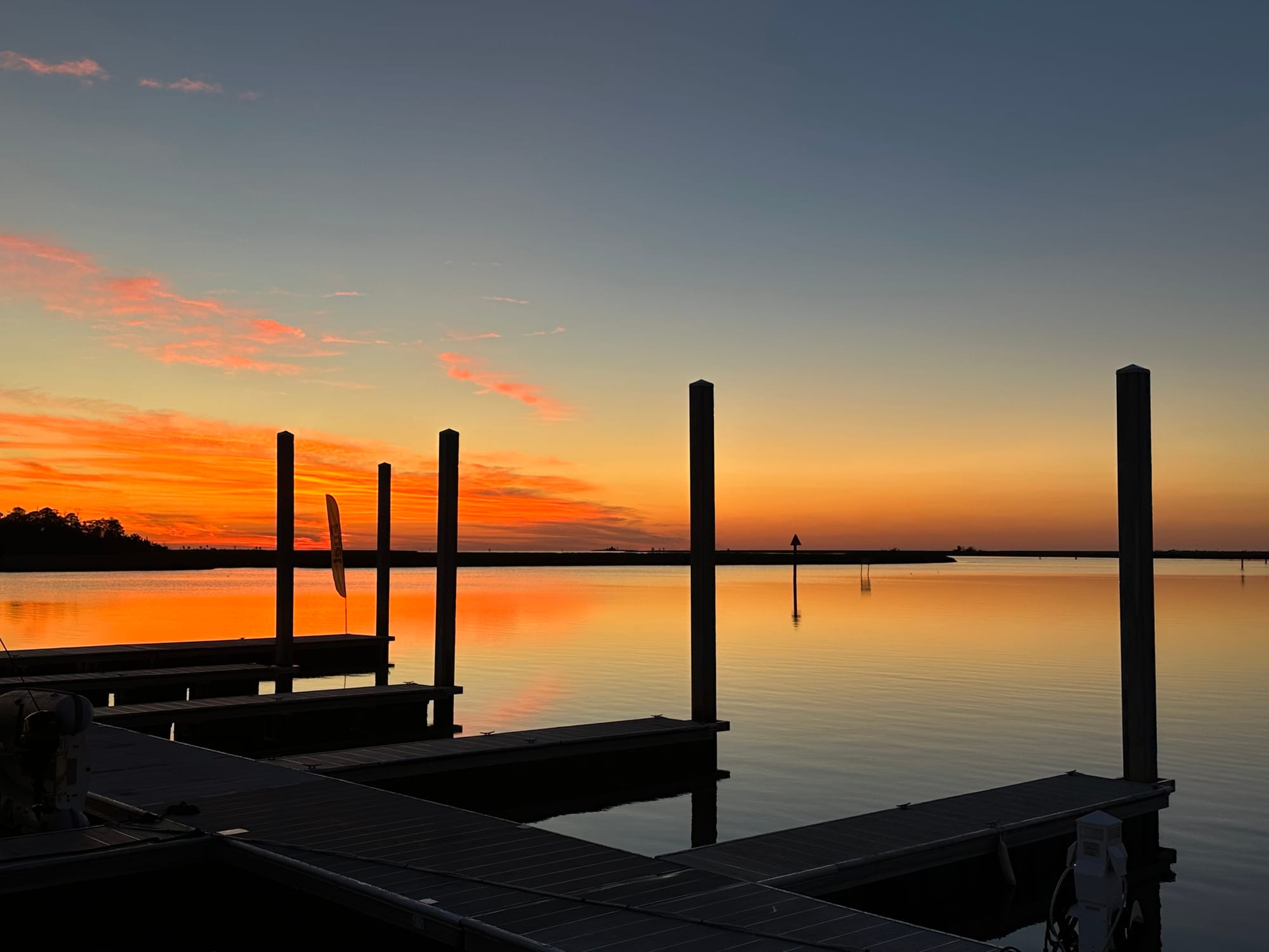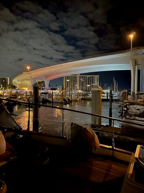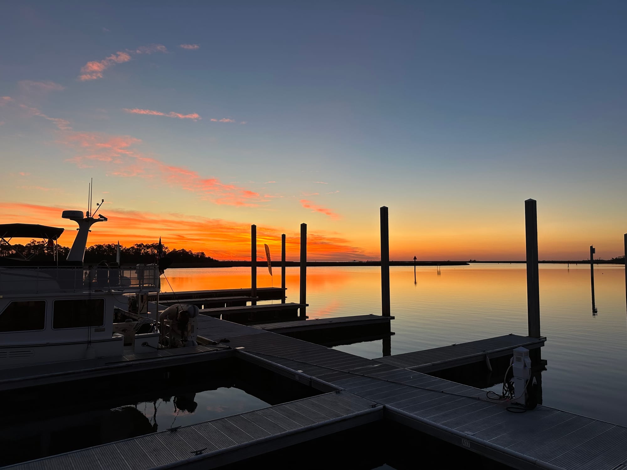Left our slip at Clearwater Marina at 6:45; still dark, but not pitch black. Got out of the marina and tied up at the pump out dock and emptied the holding tank then went out into the channel and hovered while Pelican did same. We took our time getting to our destination as Pelican is having vibration issues in his drive chain. We encountered several bridges and we’re able to get under all without the bridge tender having to open for us. We top off at 24 feet, so we had about 2 feet clearance; helps that it was low tide. Saw a few dolphins and numerous pelicans hanging out in trees. Arrived late morning at Gulf Port Marina and were requested to first tie off on the fuel dock while they decided where to put us. After Brian filled out all the required paperwork, we were instructed to head to a slip. The slip looked narrow, but we were informed we “should” fit as it was 17’ wide. Our boat has a beam of 15”. The docks were short, so we have to back in so that we can actually get off our boat. Lauren got the boat about ½ way in and it was a snug fit, so much so, that we were stuck. She was able to get the boat out and then we were told to take it to a T-dock. Did, but then the electric pedestal (brand new) kept shorting out and we hadn’t even turned on our breaker. We were then moved to the transient dock which had older electric pedestals; no issues hooking up to them. By the time we had docked, moved off, tried to back into a slip, moved off again, tied off to a T-dock, moved off again and then finally onto the transient dock; uuuggghhh!!!! After all of that the charging unit for the thruster batteries was send an overheating warning. We had to turn off the circuit overnight to let it cool down.