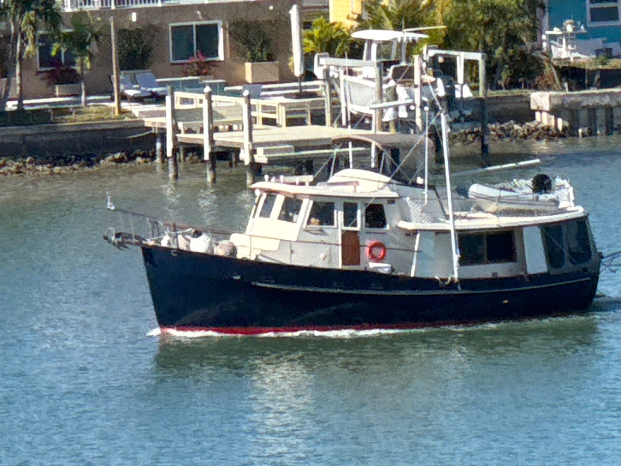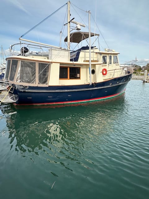 Last night, the Marina hosted a pizza party for the Loopers. There was quite the crowd. Along with meeting other Loopers, we got to see Sarah & Walt from L’ Attitude Adjustment and Matt & Lee on Slow Poke. Rick & Michelle on Flour Power and Wes on Toscana came up to us knowing we were on Heidi-Ho (didn’t know them, but we have a distinct trawler). It was a nice stress-relieving evening swapping stories of our travels. Brian never received the silicone adhesive. We left the marina before the office opened. Getting out of the slip was freaky. The winds were whipping and there was a strong current. We were stuck to the pilings on our starboard side and there was a large yacht next to us on the same side. Lauren put the engine in reverse and kept the wheel straight and went for it. The wind was blowing in one direction and the current in the opposite direction. She backed out fast, but was panicking because the thrusters did not help. The bow of the boat blew over to starboard and she was afraid we were going to hit the yacht. She got the boat out of the slip with no mishaps, but she felt it could have gone much smoother. What she should have done, was turned the wheel to starboard, so when she backed out the bow would (hopefully) stay more centered or more to port; the beauty of hindsight.
