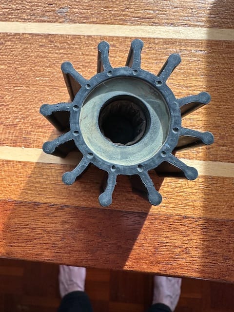 Brian also changed out the impeller to the engine; it looked practically brand new, but since it was already in place when we purchased our Heid-Ho, he thought it might be prudent to change it out. Research shows the impeller’s longevity varies, but typically requires replacement every 1-3 years or 100-300 operating hours depending heavily on usage. Saltwater demands more frequent changes and the water quality (if it’s sandy; abrasive) could reduce the impeller’s pumping efficiency. The impeller’s purpose is to act as the heart of the cooling system. It has flexible rubber vanes to pump cool water from outside the boat through the engine to prevent overheating, transferring energy from the motor to the water for circulation and heat dissipation.