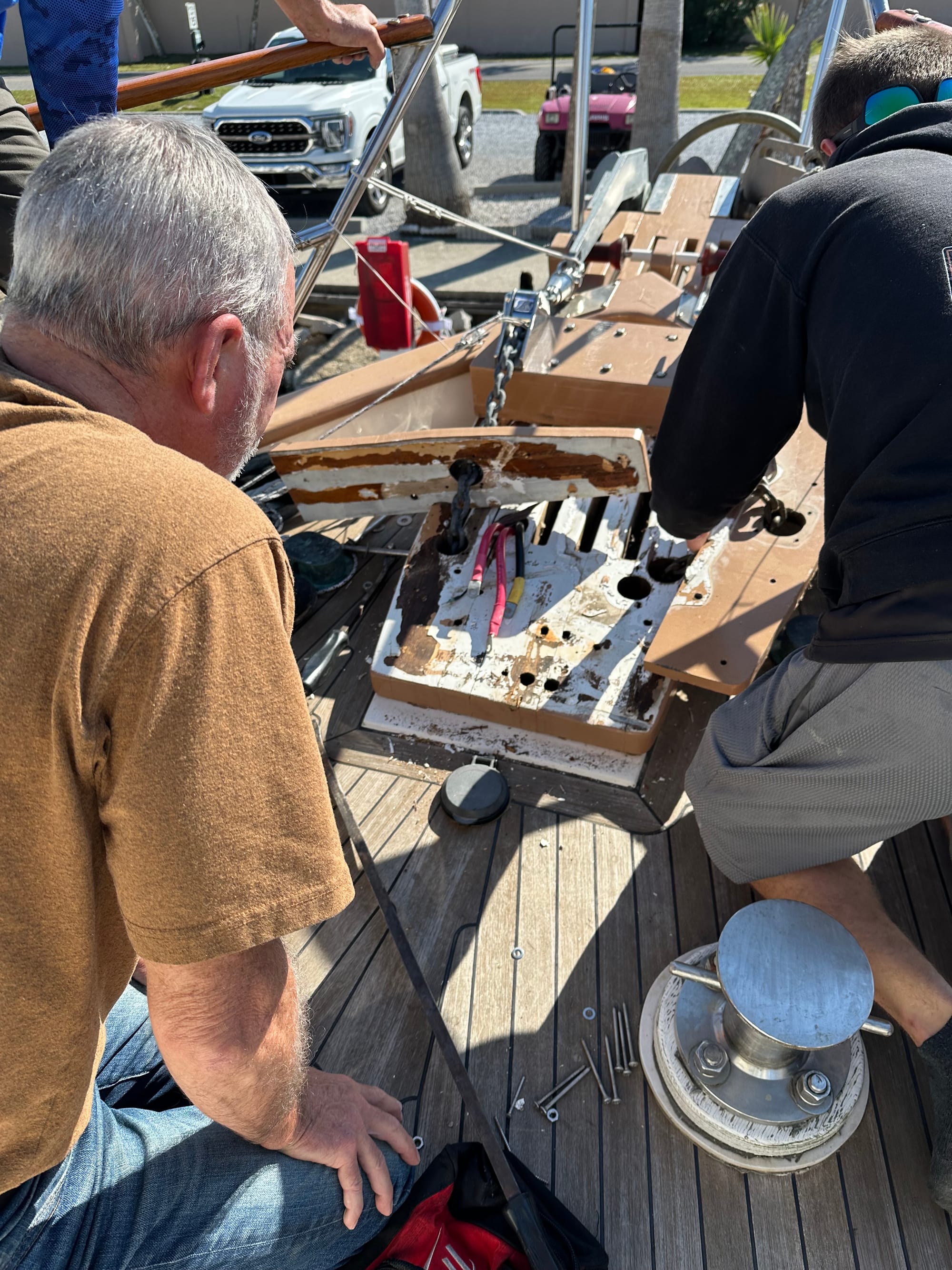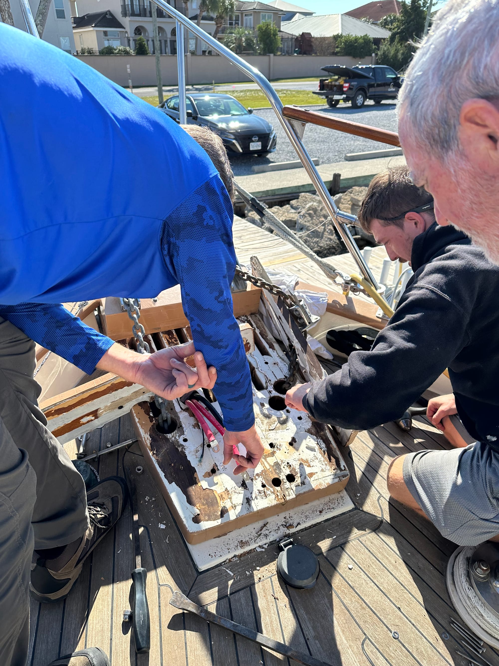 We turned around and headed back to the marina so they could fix the issue. The first marine tech was all over the boat trying to figure it out – no such luck. Guess he has to bring in the big guns :). It took several hours trying to figure out the problem. Once the techs eliminated any obvious error they may have made when they took apart the windlass to plug holes, it was onto dismantling the platform the windlass was sitting on. We had previously discovered a leakage problem coming from the windlass; the water would drip into the storage area at the head of our bed. Before we left to fly back home for Thanksgiving, the marina employees dismantled the windlass platform. There were at least 7 holes from previous work done over the years on the boat that had not been filled. So, when it rained, the water would wick under the platform and drip into the storage area. Our main concern would be water wicking into the core and spreading throughout the boat. Back to the issue: the techs then dismantled the windlass on the platform and discovered that one wire was not properly attached. Problem solved. It took hours, though, to track it down. After securing the loose wire, the windlass was put back on the platform and an adhesive was applied between the windlass and the platform. We were moved off the fuel dock and put back into the slip we had left this morning. Paul and Jill were also able to secure a slip for the night. While all of this was going on, Lauren made a baked mac and cheese with ham for a late lunch/early dinner while Brian changed the Racor filter unit for the generator. The old one was leaking and not up to current codes. Early evening we played Liverpool with Paul and Jill and agreed on leaving at 7 the next morning.