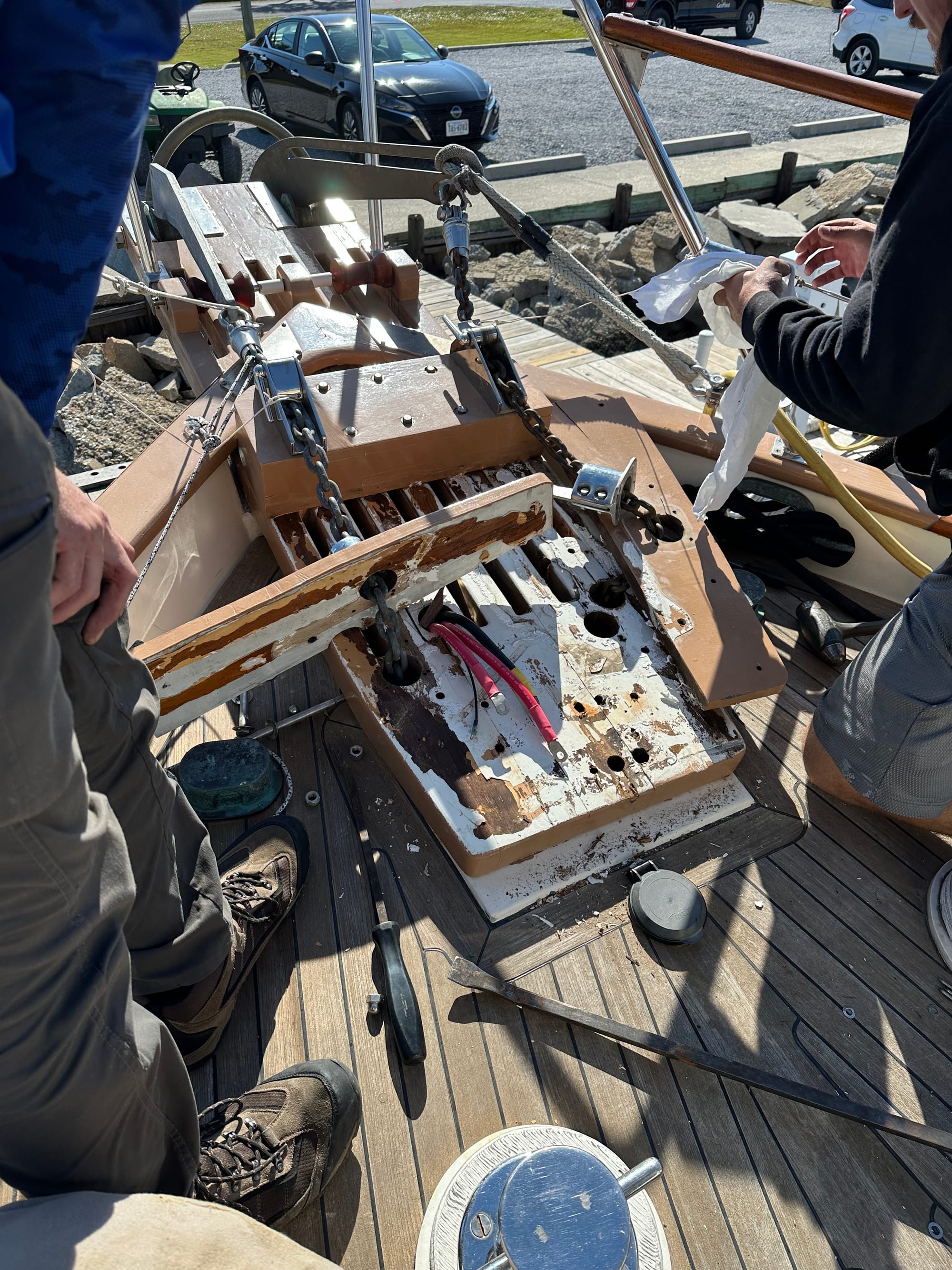 This morning, we were out of slip by 7:20. About 4 miles out, we discovered our windlass was not working. We were planning on spending the next several nights anchoring. Our main anchor weighs about 75lbs. Even if we could drop for anchor, pulling it up would be difficult for us. Brian called Two Georges to let them know the issue. We let Paul and Jill know about the issue as they were traveling with us. “No worries, we’ll head back with you and anchor out in the bay.”