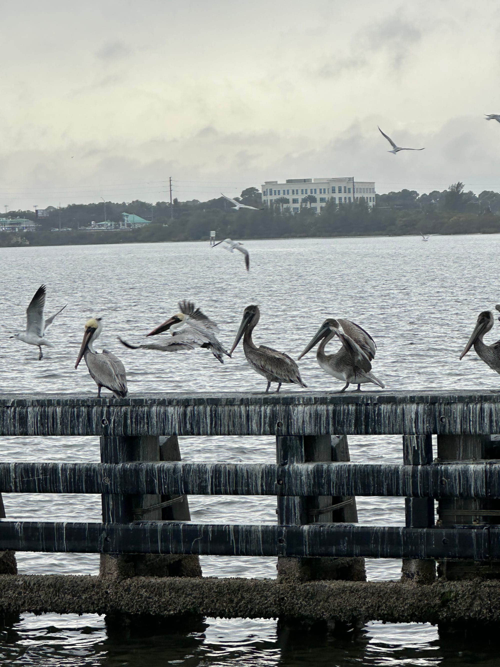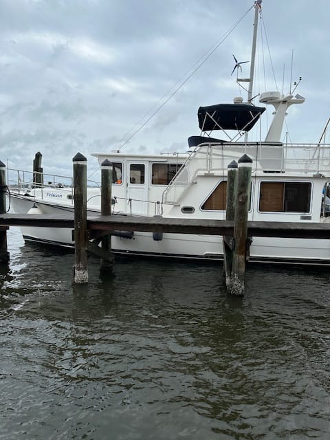 Upon arriving at our destination, the marina personal requested that we back into our slip, because any winds coming out of the north, north/west would impact us. With the bow facing out, it would break any waves and help keep us from being pushed into the dock at the stern. We were told that if a slip opens up in their more protected area, we may be able to move, since we will be here for at least a month and be a bit more comfortable. At the moment, the winds are whipping, but the rocking is minimal. It took Lauren 3 tries to get the boat backed into the slip, because of the winds. Third time was the charm. She, of course, was upset and frustrated. There were two dock hands waiting to catch our lines and tie us off. On the upside, she got it backed in with no mishaps and both dock hands praised her; they didn’t seem to mind standing out in the rain and winds waiting for us. After all the paperwork was taken care of for the marina and we got the lay of the land, Lauren noticed that Pelican, The Pelican, that Paul and Jill traveled the Loop on was parked two slips over from us.