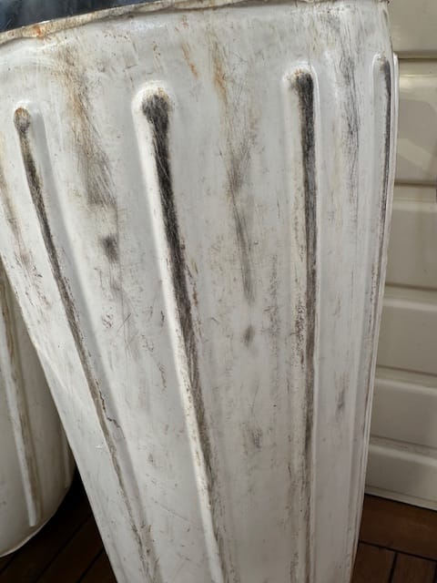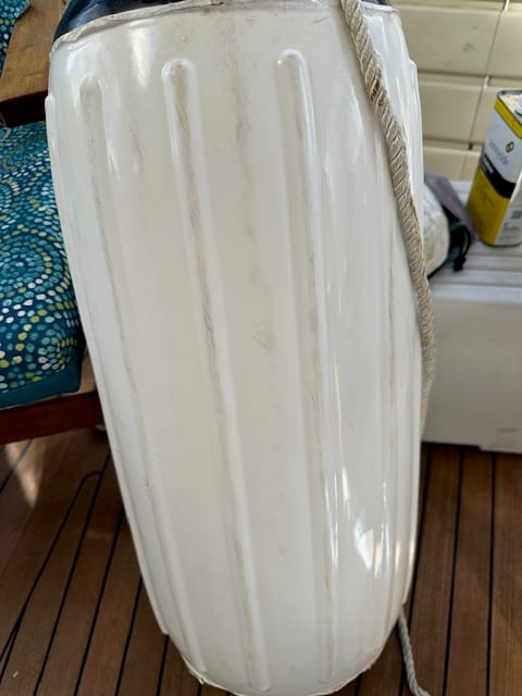 This morning, Brian was able to get two to three coats of varnish on all of the railings and doors. Lauren stayed out of his way and scrubbed down our six oblong fenders. She used soft scrub to get off the dirt and scuff marks. Then after they were rinsed and dried, she applied a coat of tire cleaner for an extra clean and shine.