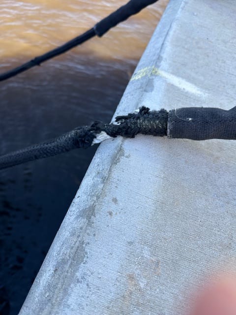 Before heading to Ohm, the temperature dropped quite a bit and the winds had picked up significantly. It was the first time on our Loop trip, that we had to keep the heat on all night. Brian had spent the last several days constantly checking our chafe guard as the lines are rubbing on the concrete wall. This morning when we got up, he noticed that the chafe guard had slipped and the line was almost chewed through. Caught just in the nick of time.