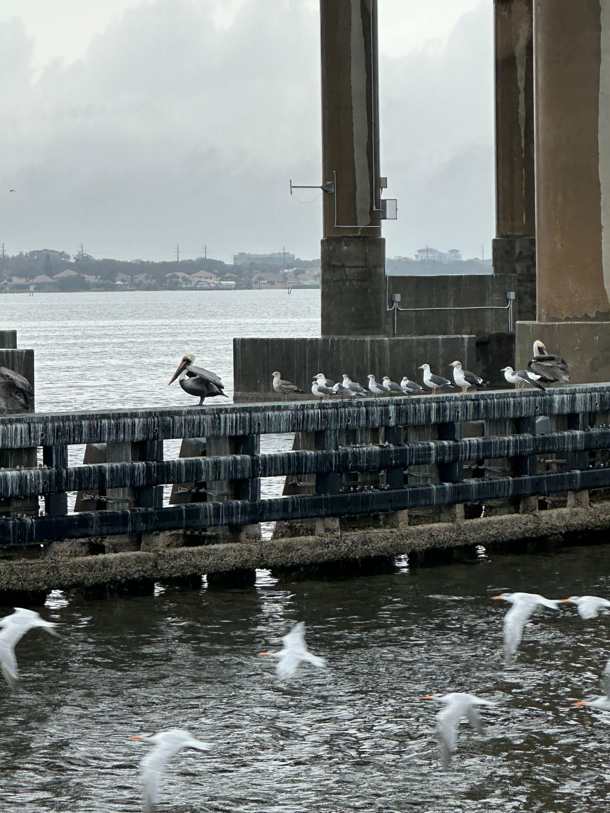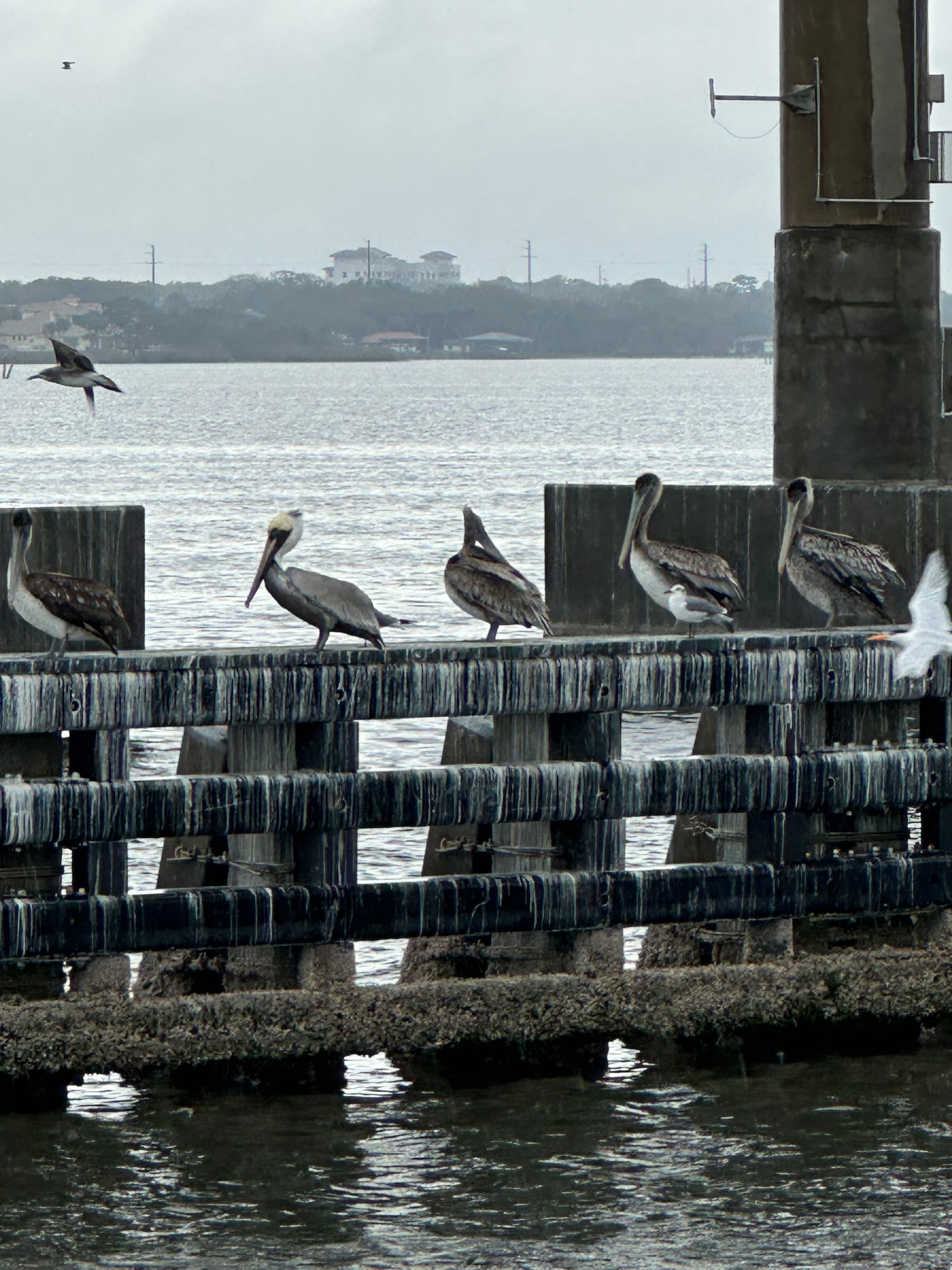It rained for a few hours and the wind picked up about 2 hours out from destination. Because of the rains, we had a quiet day on the water; nary a fishing boat to be seen. We actually saw more sailing boats (motoring) than any other vessels. We encountered many dolphins today; probably 50 or more. They would swim beside us or at the bow of the boat as if they were guiding us. It’s enjoyable to watch them. When we passed under the bridges, there were numerous types of birds taking shelter.