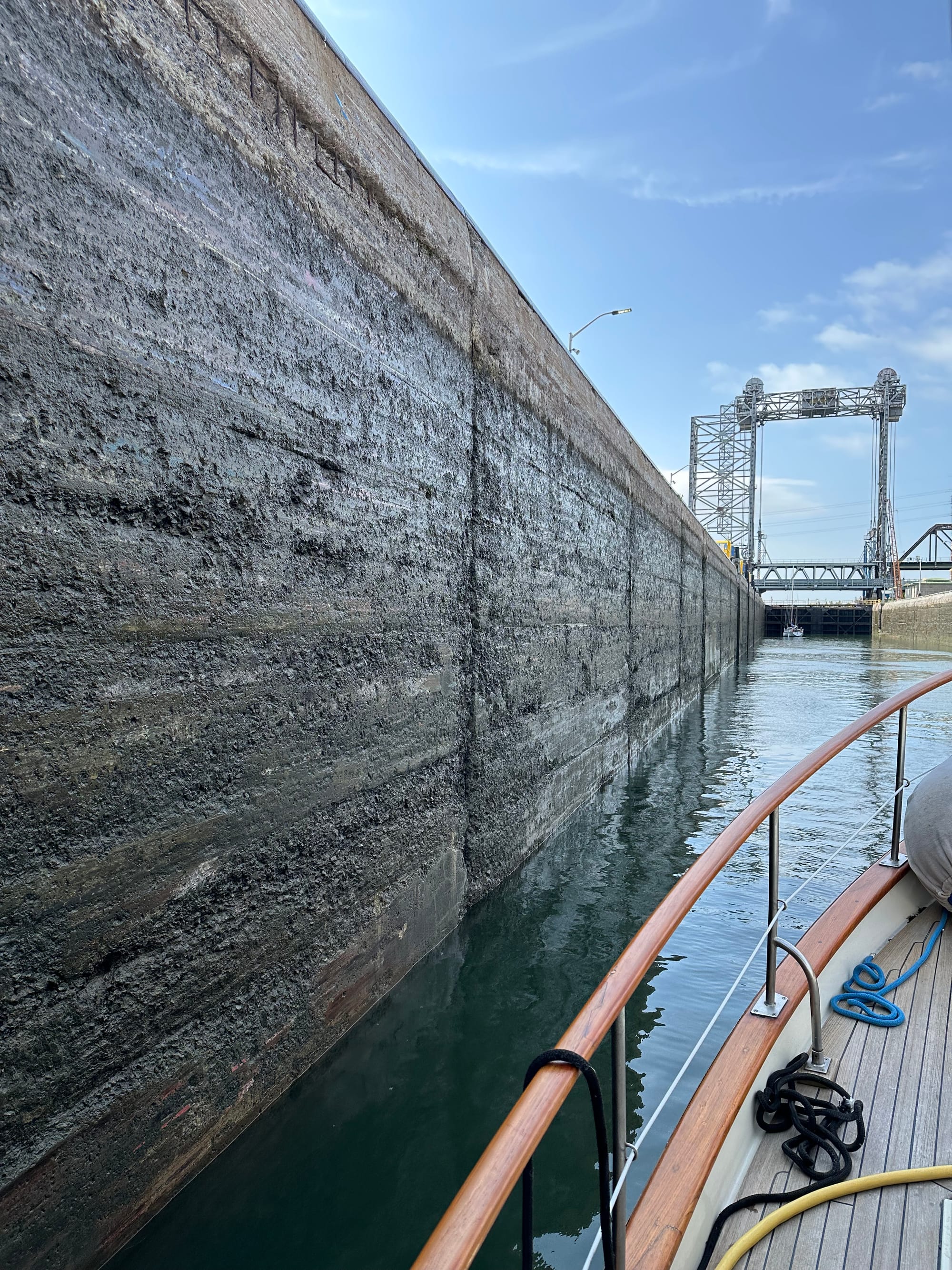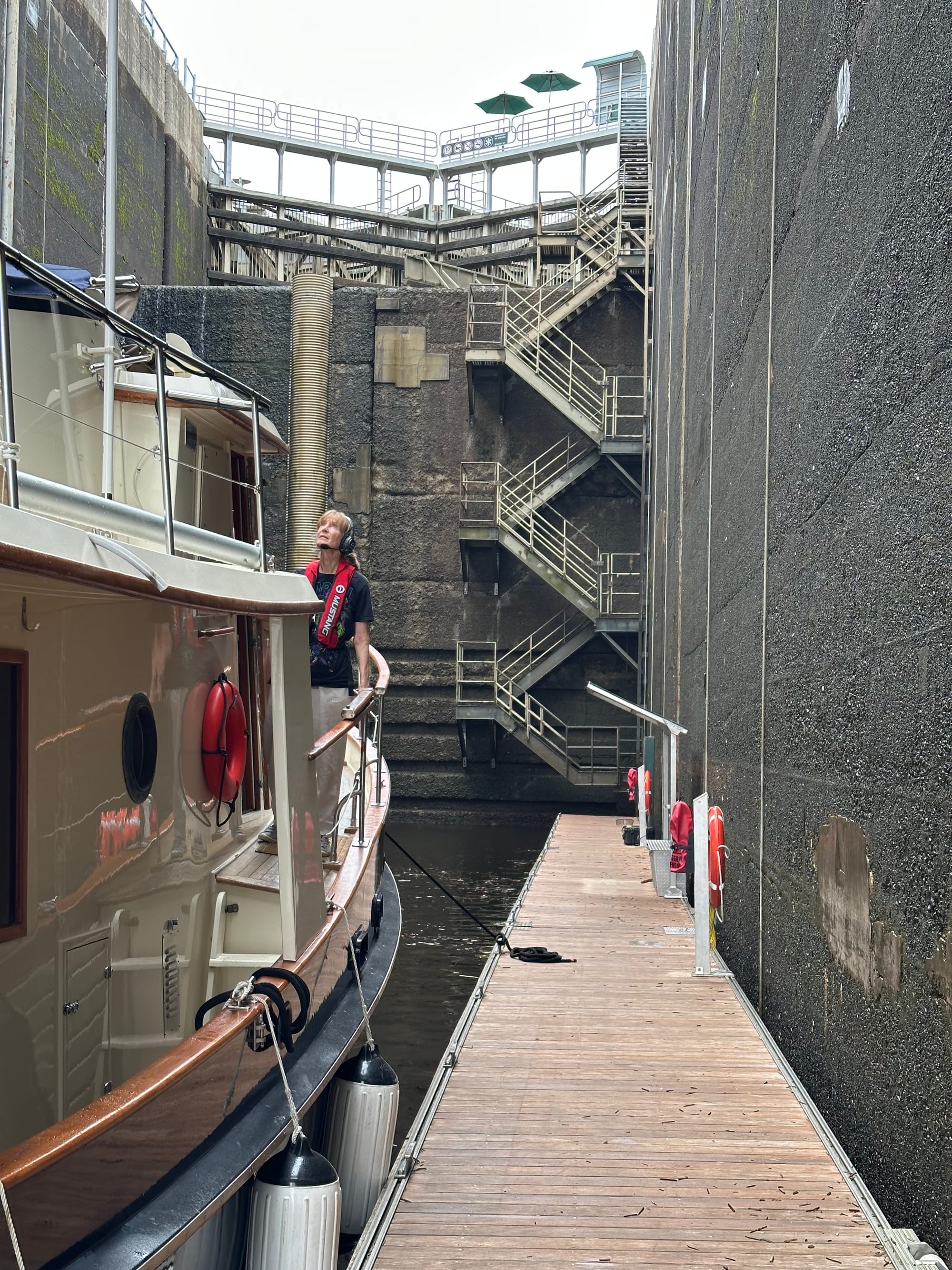 Since we’ve started our cruising, we’ve encountered several types of locks. Some we’ve had to use the lines that were provided by the lock tenders (usually so gross that you had to use gloves); another method was that the attendants would throw lines from the top of the walls down on your boat for you to hold onto while the lock either fills or empties. We’ve also encountered floating docks where the lock tenders sometimes tied our lines to the floating docks (our favorite). We’ve encountered floating docks where we’ve had to tie up our own lines.