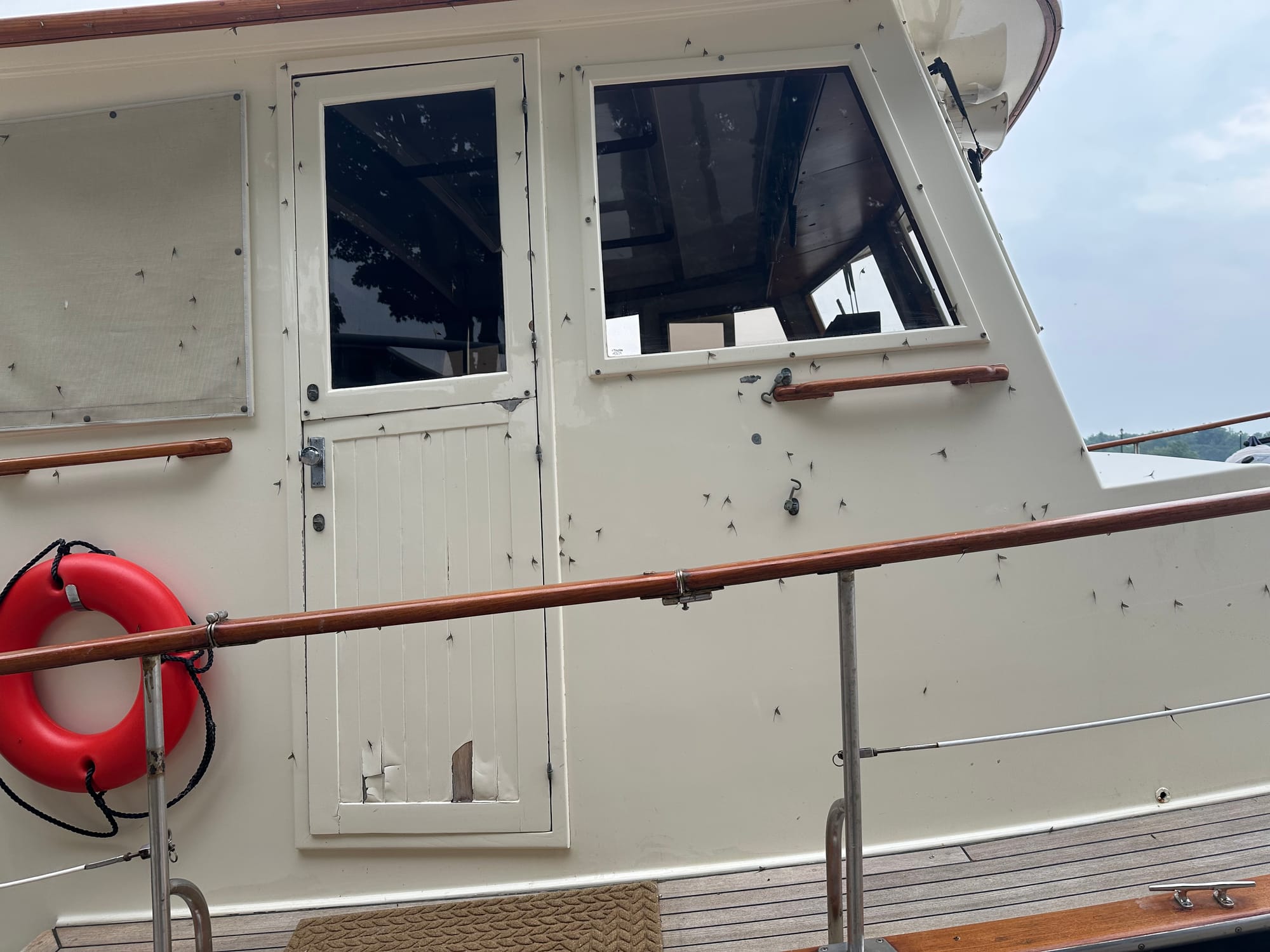 Pulled up anchor in Mahagony Harbor and headed back onto the Rideau Canal. Other than 4 kayakers, we saw no one most of the day. Even though parts of the Rideau look wide, you really have to stay in the channel as the sides are too shallow for us. As we moseyed along, we checked out various waterfront properties; quite the variety of dwellings and the landscaped (some) yards were rather varied. We navigated several bridges; a couple of swing bridges and seven locks. After our first lock, we joined another boat in the remaining locks along the way. Brian thought the name (Solitude) and boat looked familiar. We had actually met these Platinum Loopers (Conrad and Amy) in Half Moon Bay on the Hudson River in New York. Lauren couldn’t remember their names at first, but she remembered that they had already transited the Loop twice and on this trip they were trying to figure where a good place is to retire to. During the last lock, Lauren got the attention of Conrad and asked about their trip. He said they were going to travel the Trent Severn, then onto the Erie Canal and then back down around to New Berne, NC for the winter. As we were rising up in our last lock of the day, Brian noticed town docks and asked one of the attendants about them; free dockage and there was also electricity on them; may need that for the a/c tonight. We were the only boat on the dock. We cleaned up; another hot sticky day and walked to the downtown for a bite to eat. Lauren’s fish tacos were bland and the soft shell was too difficult to chew, so she was rather disappointed in her meal. Brian had a hamburger that was tasty but over-cooked. As we were eating our meals, a nasty little thunderstorm came through. Of course, we had the hatch and a few windows open so Heidi didn’t roast. The sun came out just as we were leaving the restaurant, so we high-tailed it back to the boat to do a mop up. We were surprised that nothing came through the hatch, but our aft deck looked like someone had hosed it down. Since the sun was shining, we both grabbed absorbent cloths and wiped down the entire boat. Just as we were finishing up, two boats came to the dock; one is a Looper – hopefully, we will have an opportunity to chat with them. Not 15 minutes later, another front came through, same as before but with much higher winds. Lauren went out and re-wiped the whole boat down again and then gave Heidi a cleaning and herself another shower; and since she was in there, why not pull up the teak grate in the shower and scrub that and the basin.