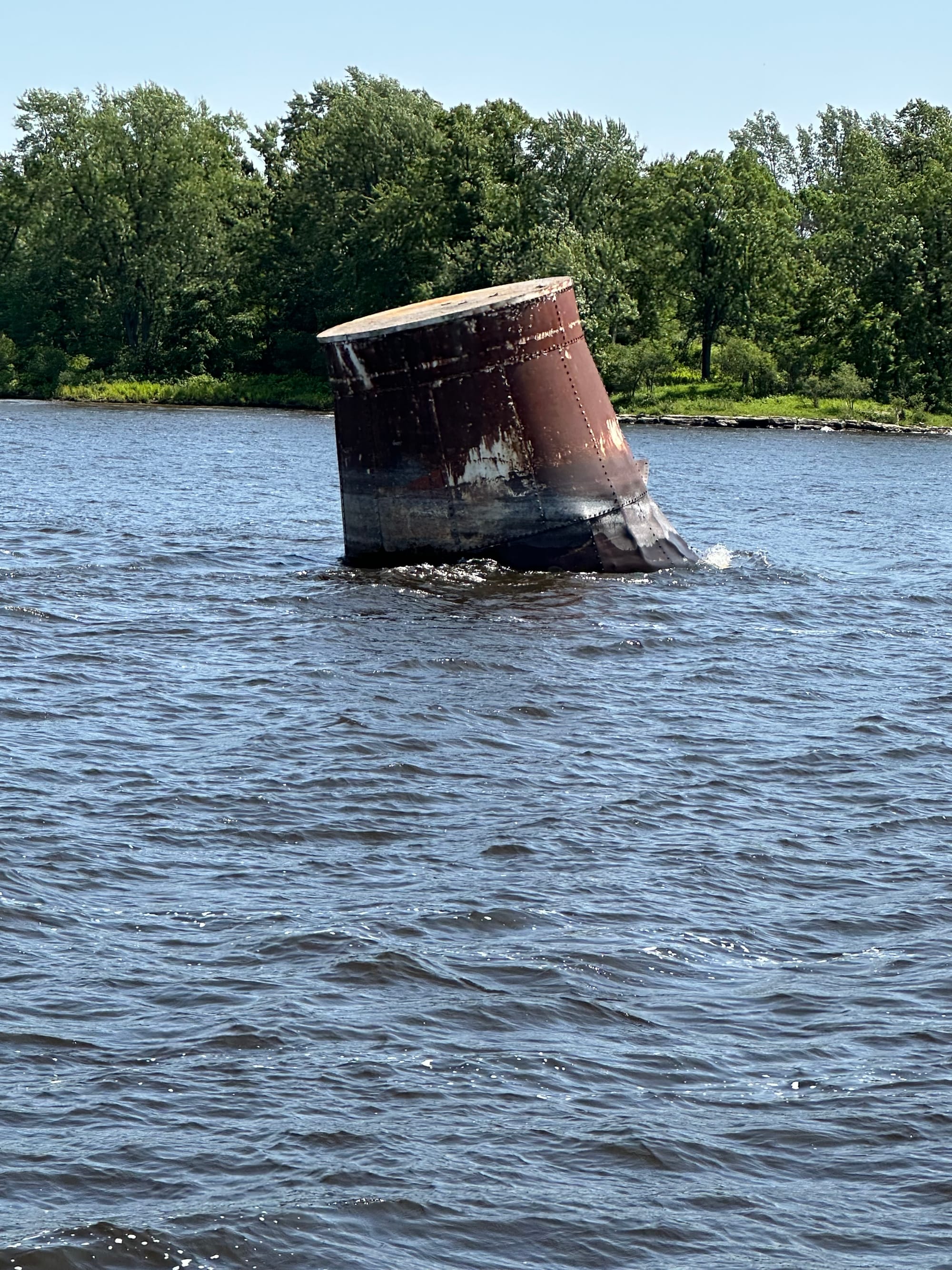 Last night the wind gusts were up to 40 knots and the waves had us tight against the dock. We had a burst of rain come through and since our hatch to the bedroom was open, the end of the bed got a bit wet. This morning, the winds were 20+ knots, but we were able to get off the dock without incident. In fact, it went way smoother than anticipated. We left Hawkesbury at 7:20 and headed to Ottawa. We traveled 50.8 miles; took us 8 hours and 25 minutes with an average speed of 6.1 knots; a long day. The first two hours of travel we thought for sure we would have heavy rains as the skies were black with low hanging clouds. But they eventually gave way to sunny skies, though the winds never abated until we almost finished for the day. We’ve been surprised that we haven’t seen any other Loopers and most pleasure craft are traveling in the opposite direction of us. We did get waked today; a yacht came way too close and didn’t slow down at all. Lauren brought the bow into his wake so that we weren’t rockin’ & rollin’; rather inconsiderate of the captain especially since we were in a fairly wide river that was plenty deep enough on the outer edges. He should have slowed way down when passing so close or moved much further away from us and still slowed down. Brian did reach out to the captain on the VHS, but as expected, no response. We cruised pass a very large metal marker – very unusual looking.