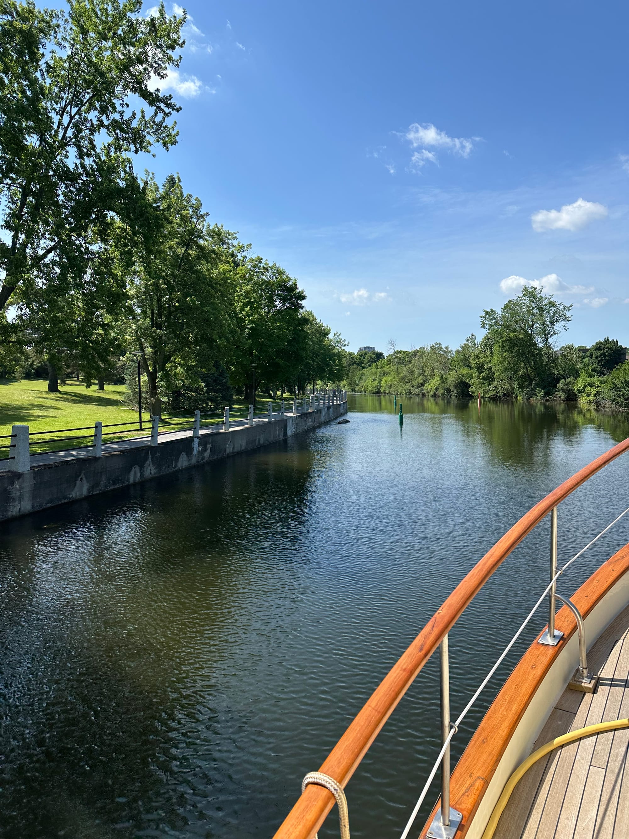 This morning we pushed off the dock wall in Ottawa about 8:45 and slowly ambled to our first bridge of the day. The bridge was scheduled to open at 9, but the bridge attendant was letting all the commuter traffic use the bridge. We tied up to the dock to wait our turn to pass. Once through we took our time up the Rideau River and Canal system. We traveled under numerous bridges (some were swing bridges – needing to wait for an opening) and six locks. There is a speed limit on the canal, so we slogged along with two other boats all morning and early afternoon. When we decided we had had enough travel for the day, we turned towards Mahogany Harbor and dropped anchor. We were told that going into the harbor was narrow and shallow (5ft) in one area; we draw about 4.7. So we crawled in and we did bump, but got right off – felt like we hit a log instead of sandbar. We are surrounded by homes that all have docks and numerous aquatic paraphernalia; rafts, wakeboards, tubes, small lake boats, kayaks, etc. and throw in swimmers. The trip today was so hot and humid; felt like we were melting. As soon as our anchor was down, we took a dip in the harbor – refreshing! Even put Heidi in her life vest and dipped her in the water; she did better than expected. There were quite a few people on the water staying cool; a few came close and said “hello”.