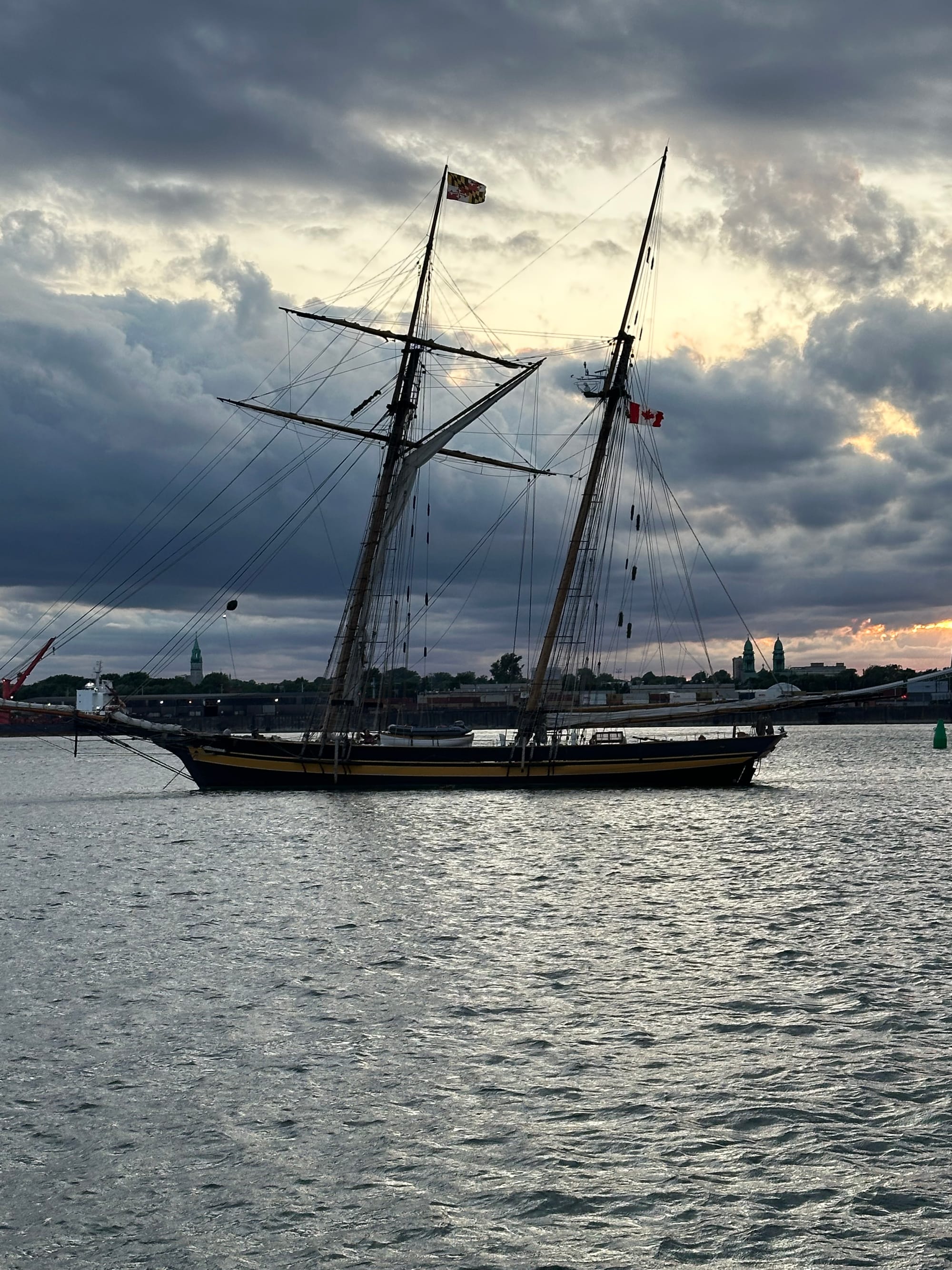 Yesterday we left Sorel and traveled to the start of the St. Lawrence Sea Way locks. We dropped anchor just before the start of the locks. It was a rocky anchorage due to the ferries and pleasure craft. A two-masted schooner named The Pride of Baltimore II anchored nearby. They are heading to the Great Lakes this summer for educational/charity work.