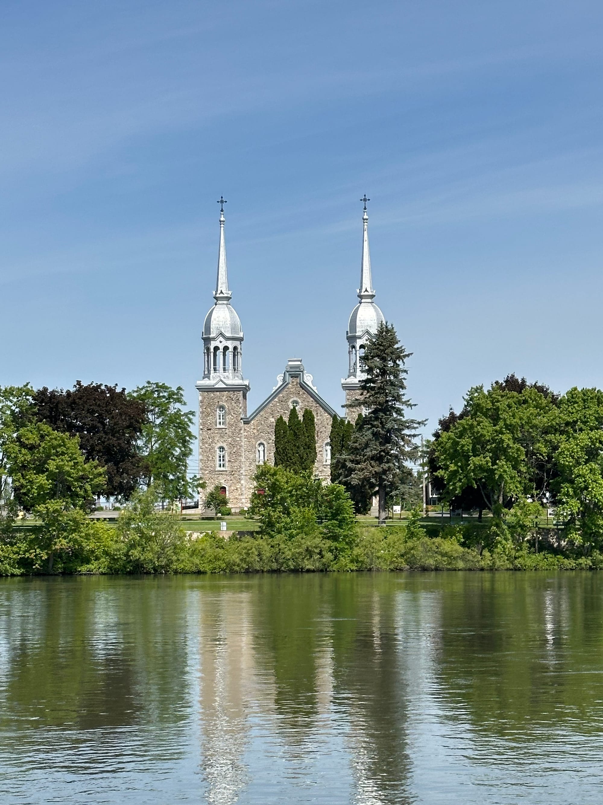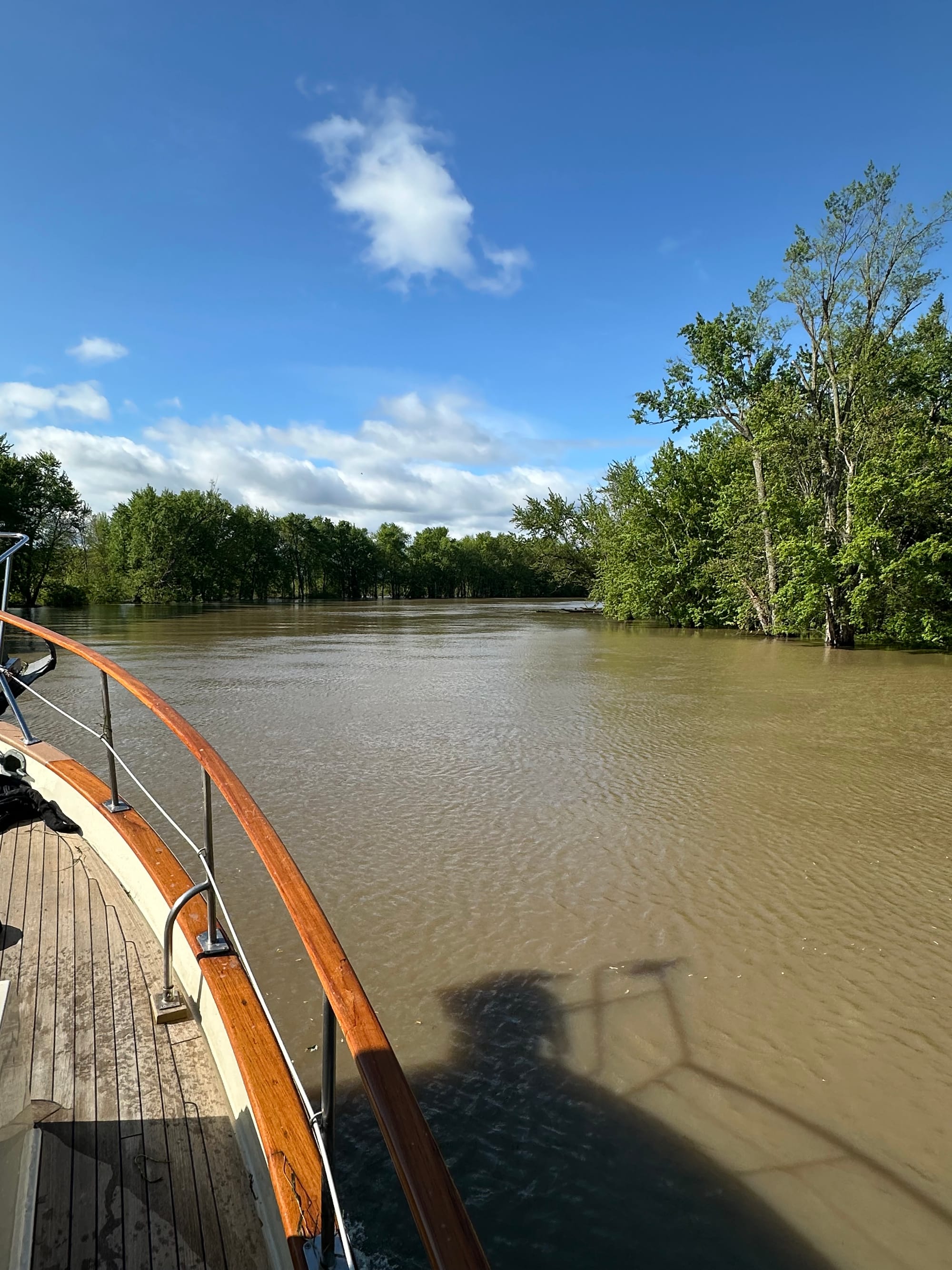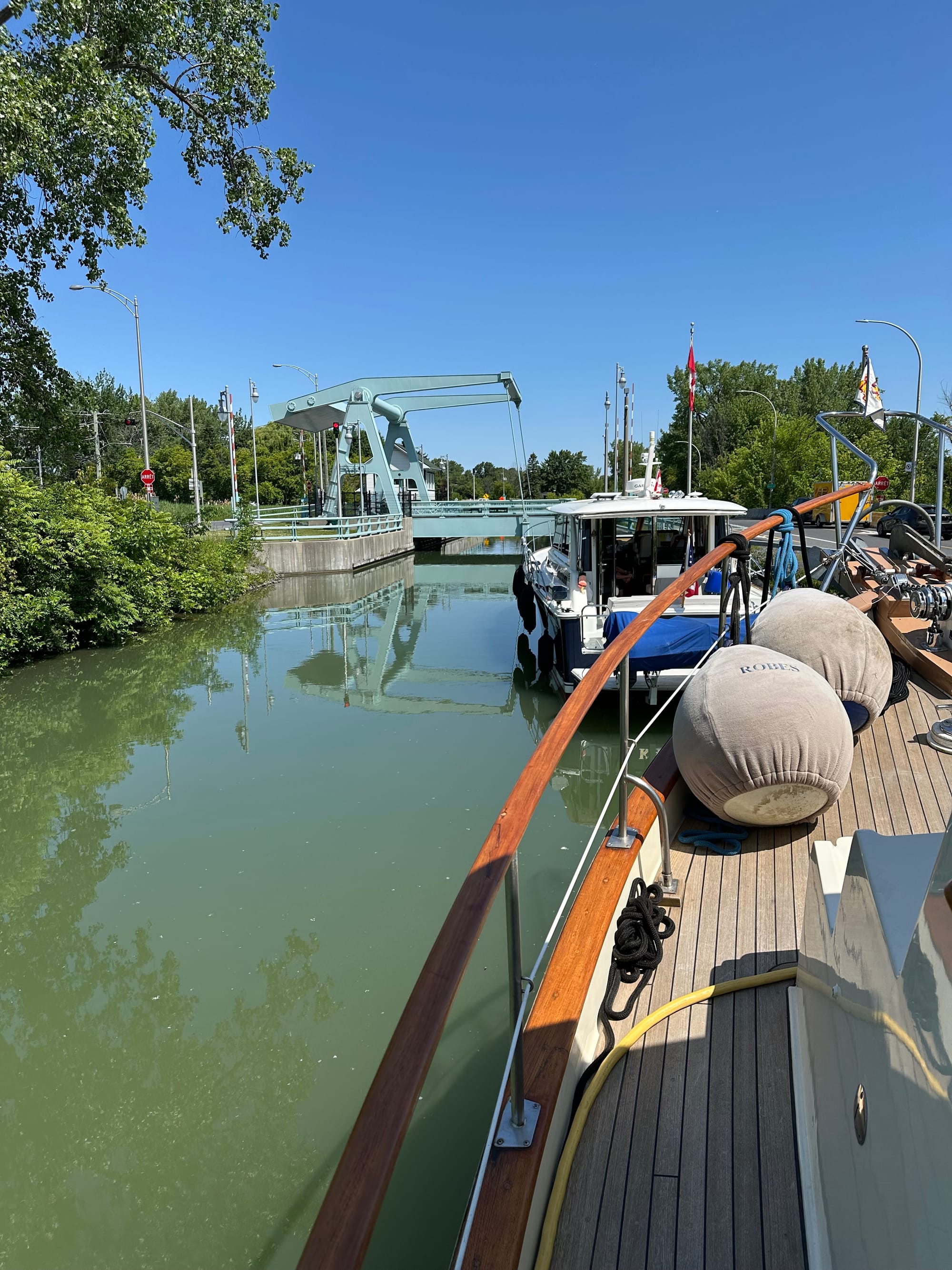 This morning, we were off the dock by 7:10 and our way to the St. Lawrence Sea Way. We traveled down the Richelieu River and only had one lock to go through. This lock was different in that once you entered it, the lock hands tied the boat up to a floating dock, which meant that we did not have to stand on the side of our boat holding lines while the water level went down. The dock hands stayed by our boat the whole time and chatted with us. The river was wide and easy to navigate with the exception of one railroad bridge. It was a narrow opening under it with the current whipping through it and the path through was not obvious until the last minute – a bit harry.