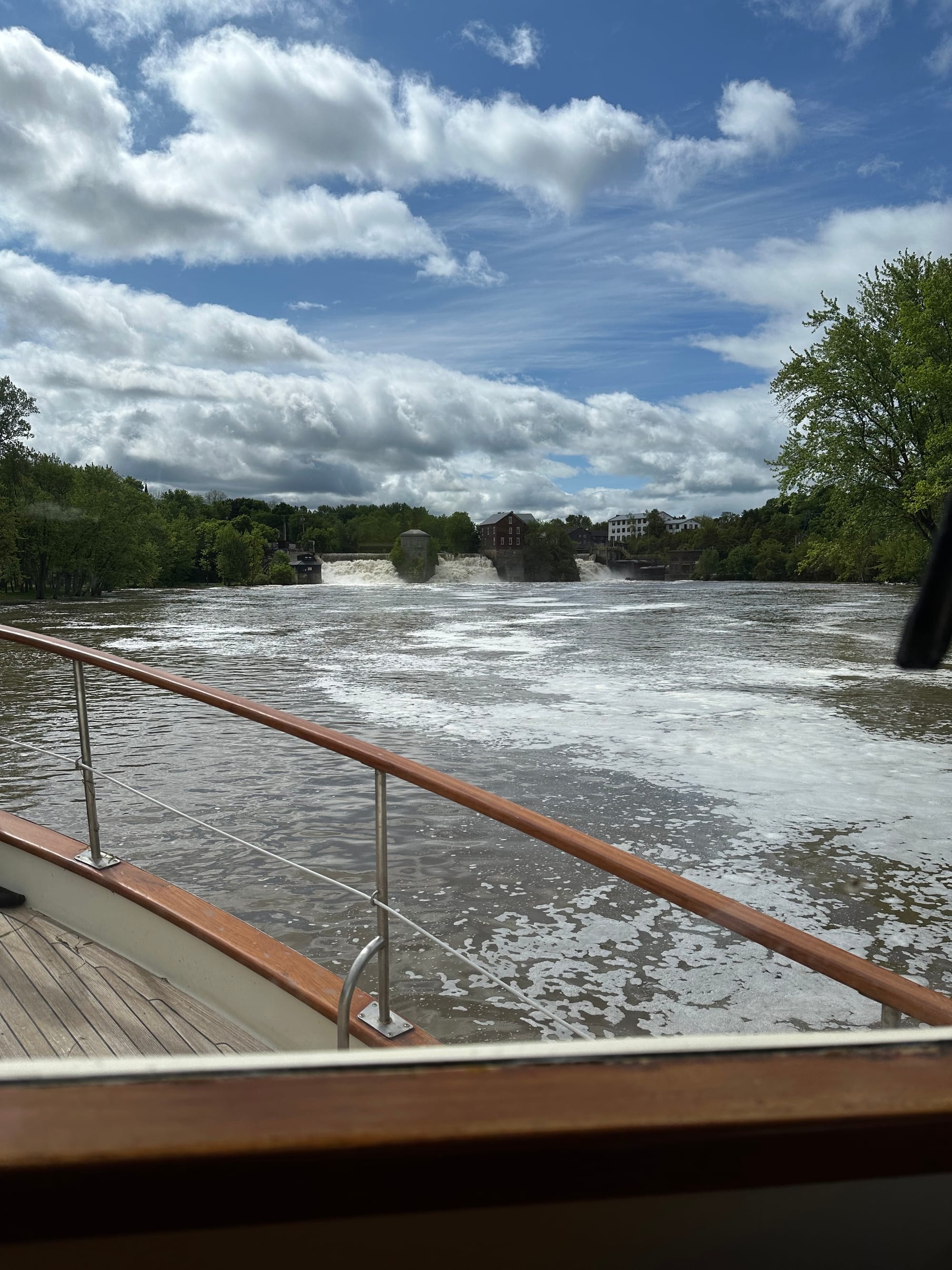 Left our anchorage in Porter Bay just north of Otter Creek about 8:30. As we exited the Creek, Lauren saw two trawlers heading North. She put binoculars on them, but wasn’t able to get the names of the boats. Shortly after, she received a call over the VHF radio; it was Karen on Rowe Boat III. Told Karen we were heading up Otter Creek to a town called Vergennes. It was a gorgeous, sun-shiny day as we meandered along. We had quite a current against us, because of the heavy rains. The ride was idyllic. Once we arrived in Vergennes, we anchored closed to the base of three waterfalls.