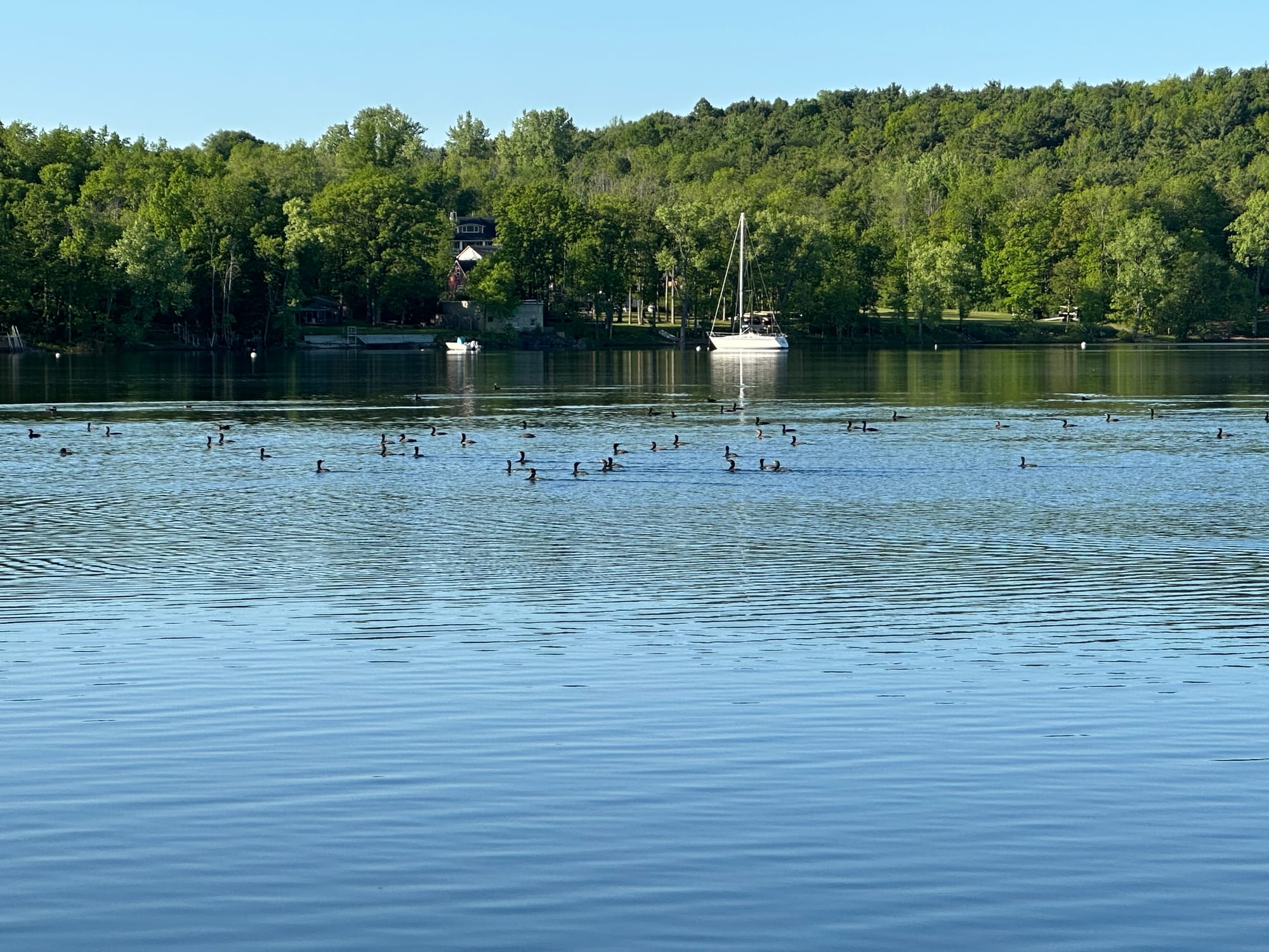 This morning while having breakfast, we spotted a female Common Merganser. Still hoping to see a Loon. Also, about 30 Cormorants came flying in landing in the water – quite a site.