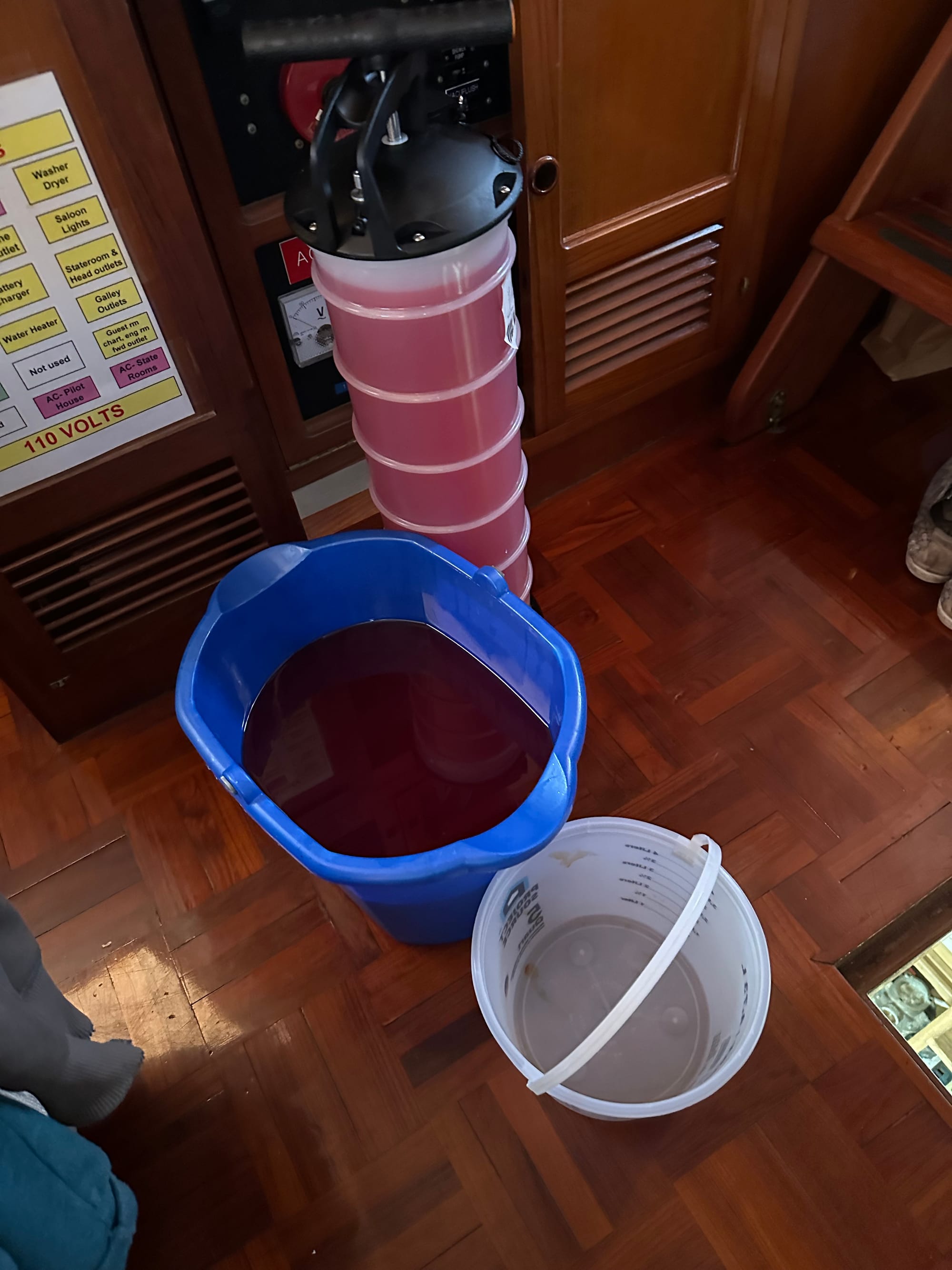 When we arrived back on the boat, Brian took Heidi out for her business while Lauren decided to start a load of laundry. It was so hot and muggy, that Lauren stripped down to almost nothing and was squatting in front of the washer/dryer unit when she heard a knock and a “hello”. Instant panic set in because we have large windows in our salon where the washer/dryer unit is located and the area is readily visible from the docks; Lauren did check to see if anyone was about before she stripped. She crabbed crawled back down to the bedroom area to throw on some clothes; rushed back up and looked out the side and saw a man from the fire department. After introductions, he pointed out that there was a small fuel slick emanating from our boat – oh dear! Lauren told him we had just filled our fuel tanks a couple hours earlier. She also explained that we do have a tank with a leak, but we did not fill that one. He came on board and looked on the other side of the boat where we had filled our tanks and noted that, yes there were some residual stains on the deck from that process. He looked overboard on that side and did not see any fuel. He left to confer with the coast guard and marina staff. Lauren told him that if he passed a guy in a blue baseball cap walking a Yorkie, that was Brian and to not hesitate to talk to him. After the fireman left the boat, Lauren opened up the hatch to the engine compartment and noticed that, yes, there was diesel in the bilge. Panic set it!!! How did this happen? As the fireman was walking off the docks, he met Brian and explained what the issue was. Brian came back to the boat and went into the engine room. Almost immediately, he found the source of the leak. The fuel was dripping from the bottom of the sight glass, something that should not happen. The site glass is used to determine how much fuel is in the tank. He was able to stop the leak by shutting off a couple of valves. He also shut off the power to all the bilge pumps. After that, he went to find the fireman and they came back to the boat. Brian showed him what the problem was and told him that the solution would be to pump the diesel into 5-gallon buckets. Since it was late in the day, there were no local stores open. Brian also called the coast guard and informed them of the issue. He was instructed to follow-up with the fire department and Vermont’s Department of Natural Resources. The fireman was in agreement that putting the diesel into 5-gallon buckets was a reasonable solution and that he would recommend it to the person at the Department of Natural Resources. A gentleman from the Department of Natural Resources called and they discussed the issue and the solution. He was in agreement that it was a good plan, but wanted before and after pictures. Brian took pictures of the diesel in the bilge and forwarded them on. This morning, Brian was at the hardware store at 7:30 and bought several 5-gallon buckets with lids. By 8:30, all of the diesel fuel was in the buckets and the bilge had been thoroughly cleaned. It turns out there was less than 6 gallons of diesel and water mixed together in the bilge. Pictures were sent to the Department of Natural Resources and the representative was satisfied and nothing else had to be done. WHEW!!! We were concerned because depending on the severity, the fines can be pretty steep.