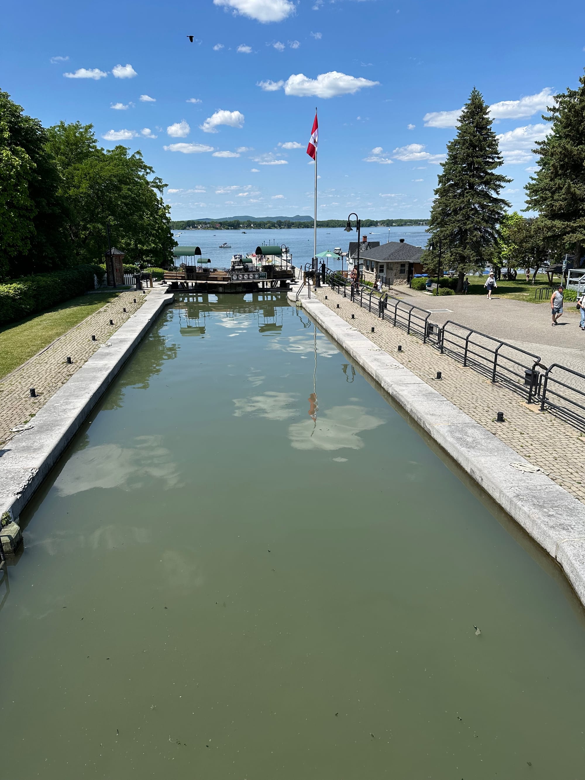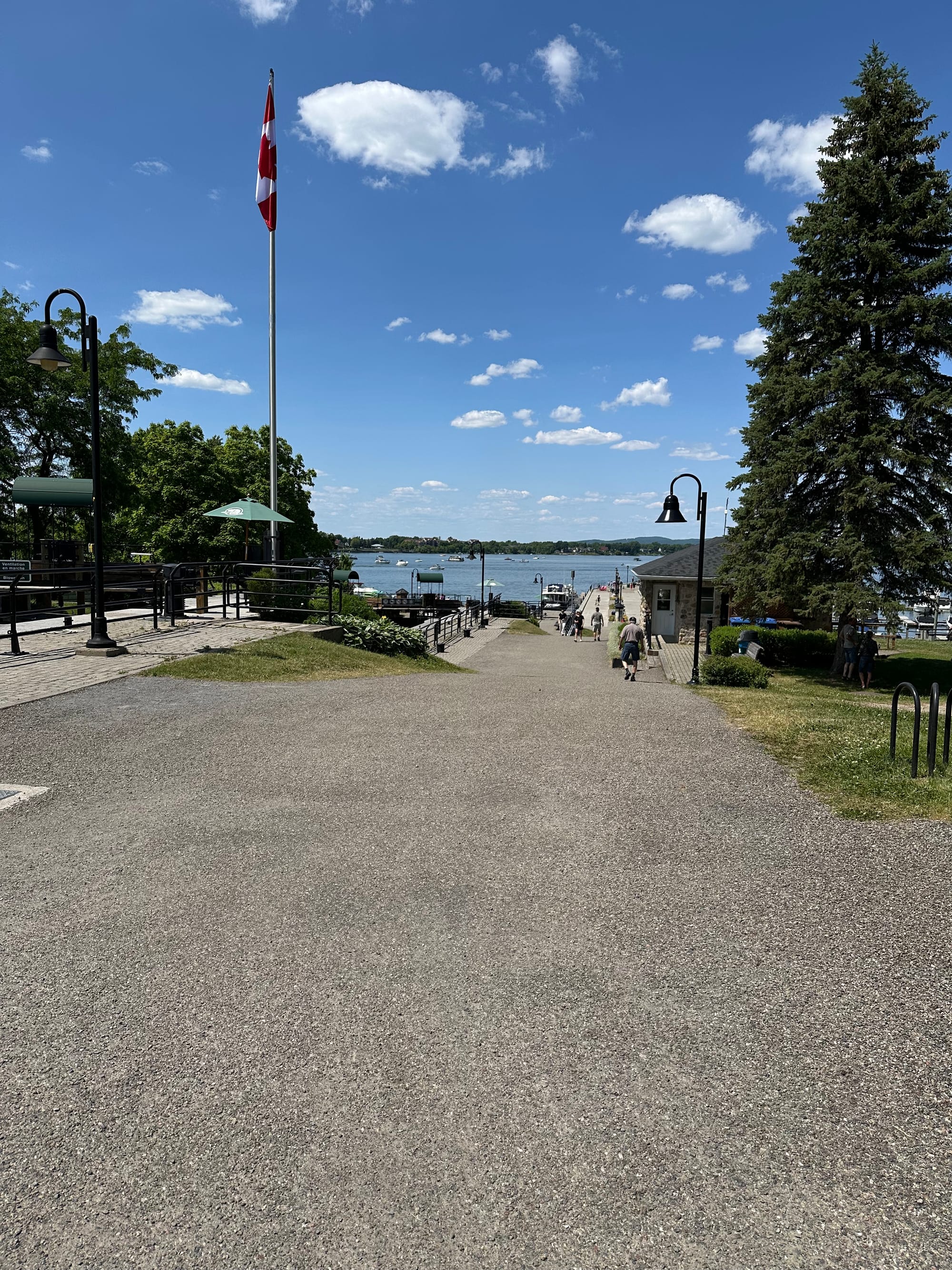 All of the lock attendants were pleasant and helpful. We were underway for 5 hours, but only traveled 10.4 miles, because of all the bridges and locks. The last three locks were right in a row. From the third lock, you looked across the remaining two locks and the lake beyond. It was quite a dramatic sight. This area is a popular tourist destination. It was good to finally stop, though we got the last open spot on the blue dock just outside of the last canal. The blue is actually for those boats waiting to transit the canal system. Brian asked and if they would give us permission to spend a night or two. If we decide to stay more than one night, hopefully a few places further up on the dock out of the blue line will open and we can move on up. We are 38 miles from Sorel-Tracy a town on the St. Lawrence Seaway. Chambly is a very picturesque area. On the entire way through the canal, we saw numerous people out bicycling, walking and running; everyone wanted to get out and enjoy the gorgeous weather. At every lock stop, there were people watching all the lock activity; nothing like being on display; makes Lauren a bit self-conscious, which heightens her anxiety to not mess up. At the end of our run, we are surrounded by many, many boats docked all around us, people milling about just enjoying this fine day. Brian took Heidi off the boat for a much-needed potty break.
